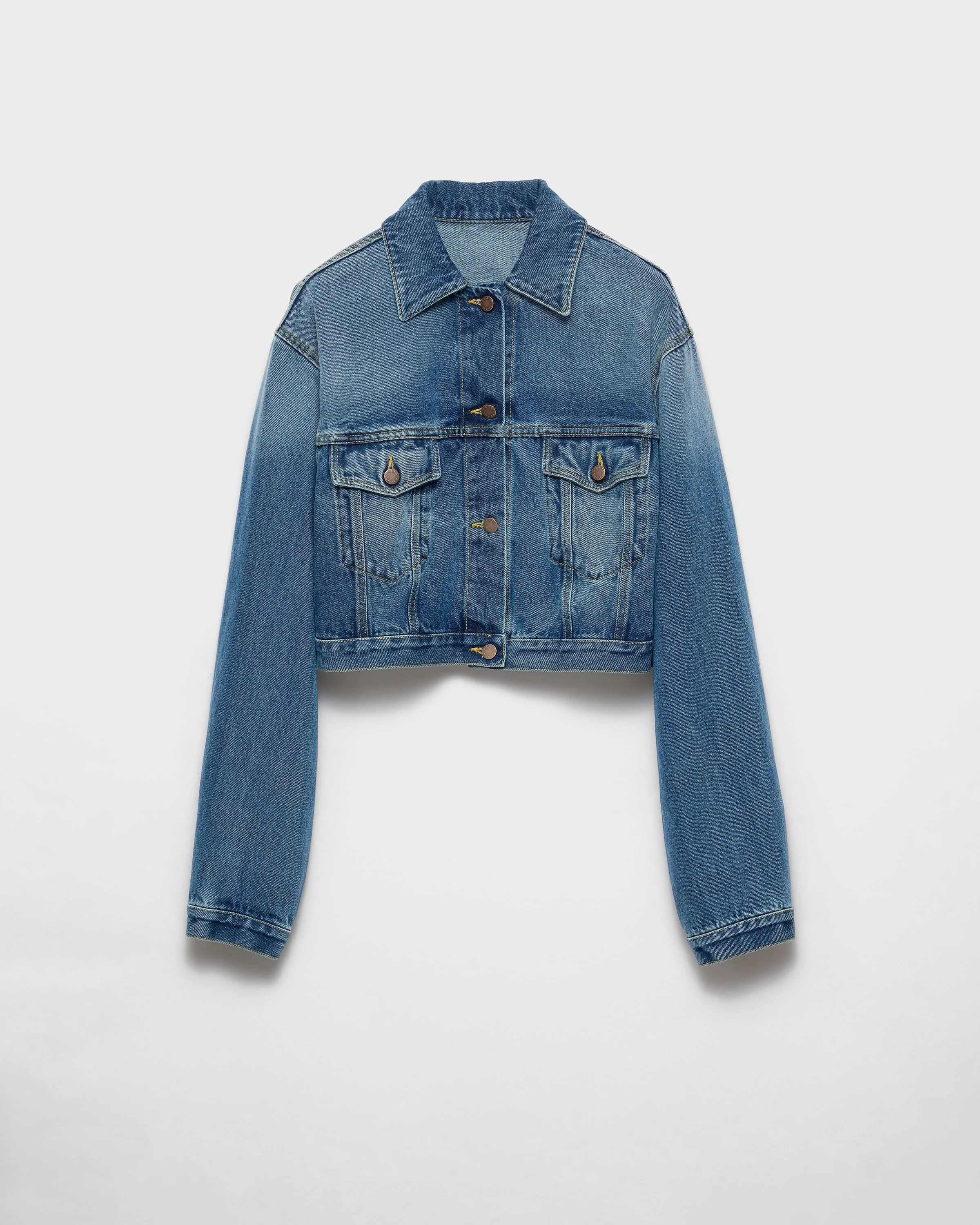 A boxy cut and rounded sleeves characterize this denim blouson jacket with a vintage finish. The contemporary lines of the silhouette are combined with details with vintage charm. - Product code: GFB318_16PK_F0V3N_S_OOO - Washed denim treatment - Unlined garment - Loose fit - Shirt-style collar - Long sleeves, cuffs with one button - Front button closure - Contrasting stitching - Flapped patch pockets with button on the front - Center-back length: 45 cm, Size: XS - Straight hem with buttons for double adjustment on the back - Prada Milano logo label on the back - Imported - The model is 176 cm tall and wears a size 38 Height: 45cm MATERIALS Main material: 100% cotton