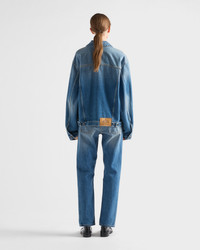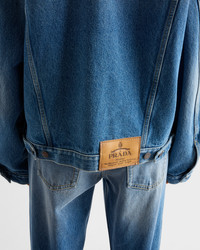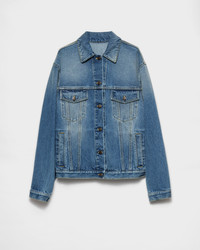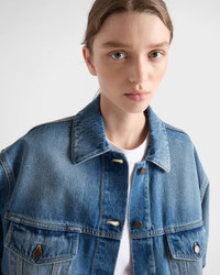 Oversize lines and unmistakable details define this stylish blouson jacket with casual style. The denim, treated for a refined, gently worn effect, gives the design vintage charm. - Product code: GFB317_16PK_F0V3N_S_OOO - Used denim treatment - Unlined garment - Loose fit - Shirt-style collar - Long sleeves, cuffs with button - Front button closure - Contrasting stitching - Flapped patch pockets with button on the chest - Low welt pockets - Center-back length: 62 cm, Size: XS - Straight hem with buttons for double adjustment on the back - Prada Milano logo label on the back - Imported - The model is 178 cm tall and wears a size 38 Height: 62cm MATERIALS Main material: 100% cotton