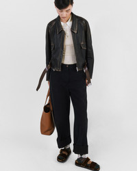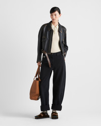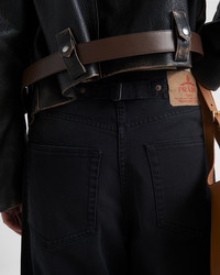 The classic five-pocket jeans style is reinterpreted with a low-rise design made of washed denim with vintage style details. The barrel leg style is enriched with an archive logo printed on a label and by the iconic geometric shape of the enameled metal triangle logo. - Product code: GFP515_148J_F0557_S_OOO - Garment dyed and washed treatment - Loose fit - Low-rise waist - Hem-width 26 cm, Size: 25 - Button fly - Matching stitching - Rounded front pockets with coin pocket - Back patch pockets - Total length: 116 cm, Size: 25 - Triangle logo - Strap with buckle on the back - Prada Milano logo label on the back - Imported - The model is 178 cm tall and wears a size 38 Height: 116cm MATERIALS Main material: 100% cotton