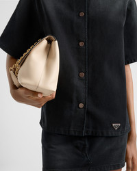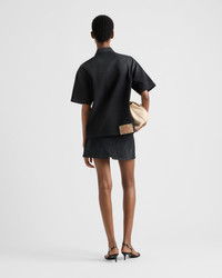 Washed denim gives this short-sleeved shirt with an oversized, boxy silhouette vintage allure. Simple details complete the style enriched by an archive logo printed on the label and by the sleek yet iconic geometric shape of the enameled metal triangle logo. - Product code: GFC053_148J_F0557_S_OOO - Garment dyed and washed treatment - Loose fit - Unlined garment - Shirt collar - Front button closure - Short sleeves - Matching stitching - Triangle logo - Center-back length: 65 cm, Size: 38 - Prada Milano logo label on the back - Imported - The model is 178 cm tall and wears a size 38 Height: 65cm MATERIALS Main material: 100% cotton