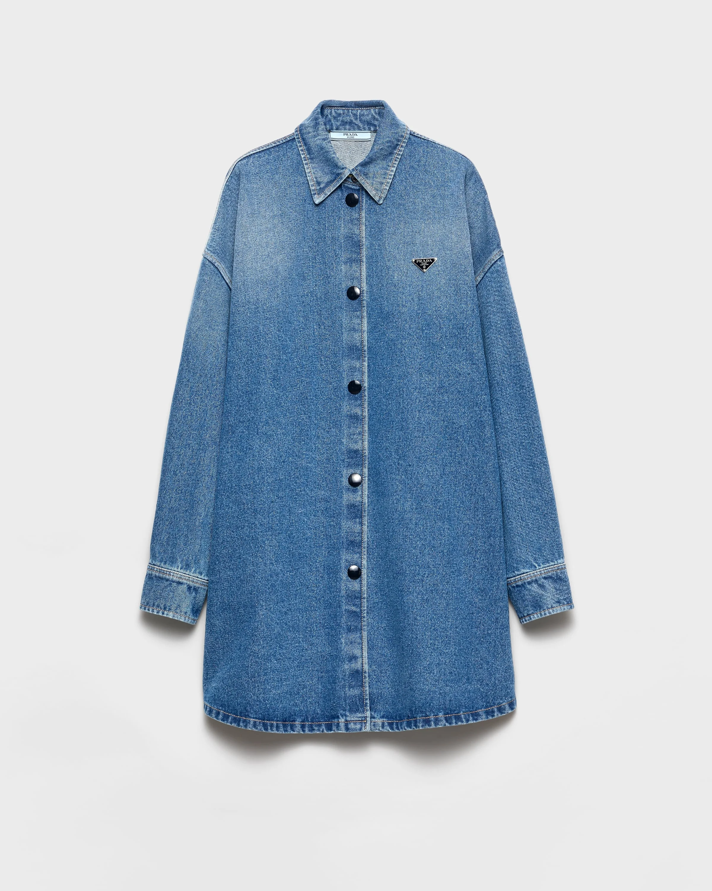 This denim shirt with a used finish has an oversized silhouette that gives it a relaxed, casual style. The enameled metal triangle logo completes the garment with an iconic note. - Product code: GFC060_16PK_F0V3N_S_OOO - Used denim treatment - Oversized fit - Unlined garment - Shirt collar - Front button closure - Long sleeves - Contrasting top-stitching. - Triangle logo - Center-back length 88cm, size 38 - Imported - The model is 180 cm tall and wears a size 38 Height: 88cm MATERIALS Main material: 100% cotton