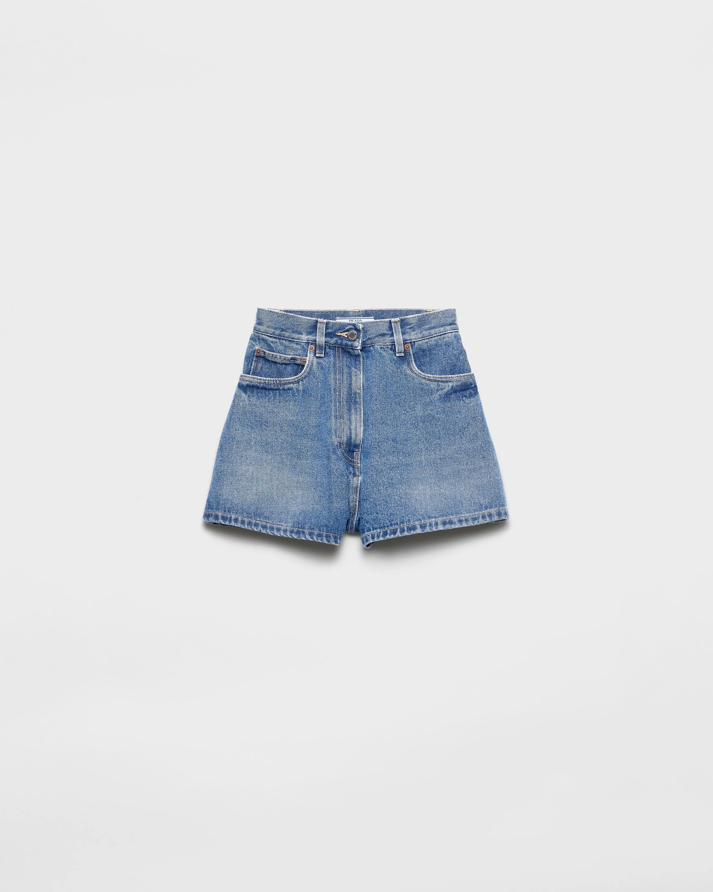 These denim shorts with contemporary allure are characterized by their high-waisted flared silhouette. The style with a used finish is decorated with the iconic enameled metal triangle logo. - Product code: GFP495_16PK_F0V3N_S_231 - Washed denim treatment - High-rise waist - Zipper fly with button - Contrasting stitching - Rounded front pockets with coin pocket - Back patch pockets - Total length 35 cm, Size: 25 - Triangle logo - Imported - The model is 178 cm tall and wears a size 38 Height: 35cm MATERIALS Main material: 100% cotton