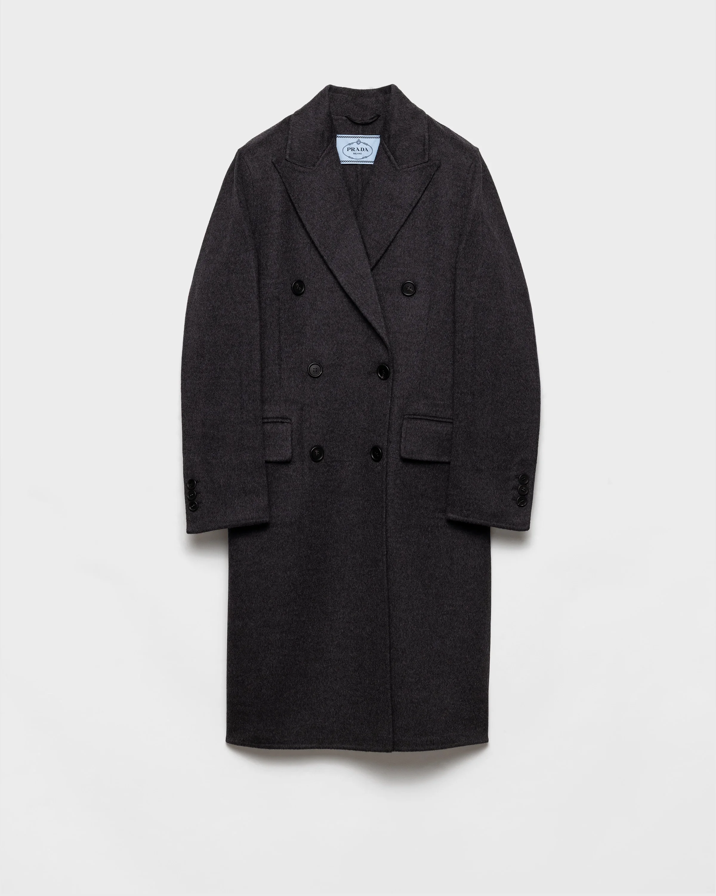 Precise lines and refined details create this coat with timeless elegance featuring a double-breasted cut with peak lapels. The garment is made of double cashwool fabric, which gives structure to the tailored silhouette completed by the tonal triangle logo. - Product code: P616S_179B_F0480_S_OOO - Menswear fit - Lined garment - Peak lapels - Button closure - Straight sleeves with four buttons - Flap pockets - Back vent - Fabric triangle logo - Imported - The model is 180 cm tall and wears a size 38 Height: 100cm MATERIALS Main material: 20% cashmere 80% virgin wool