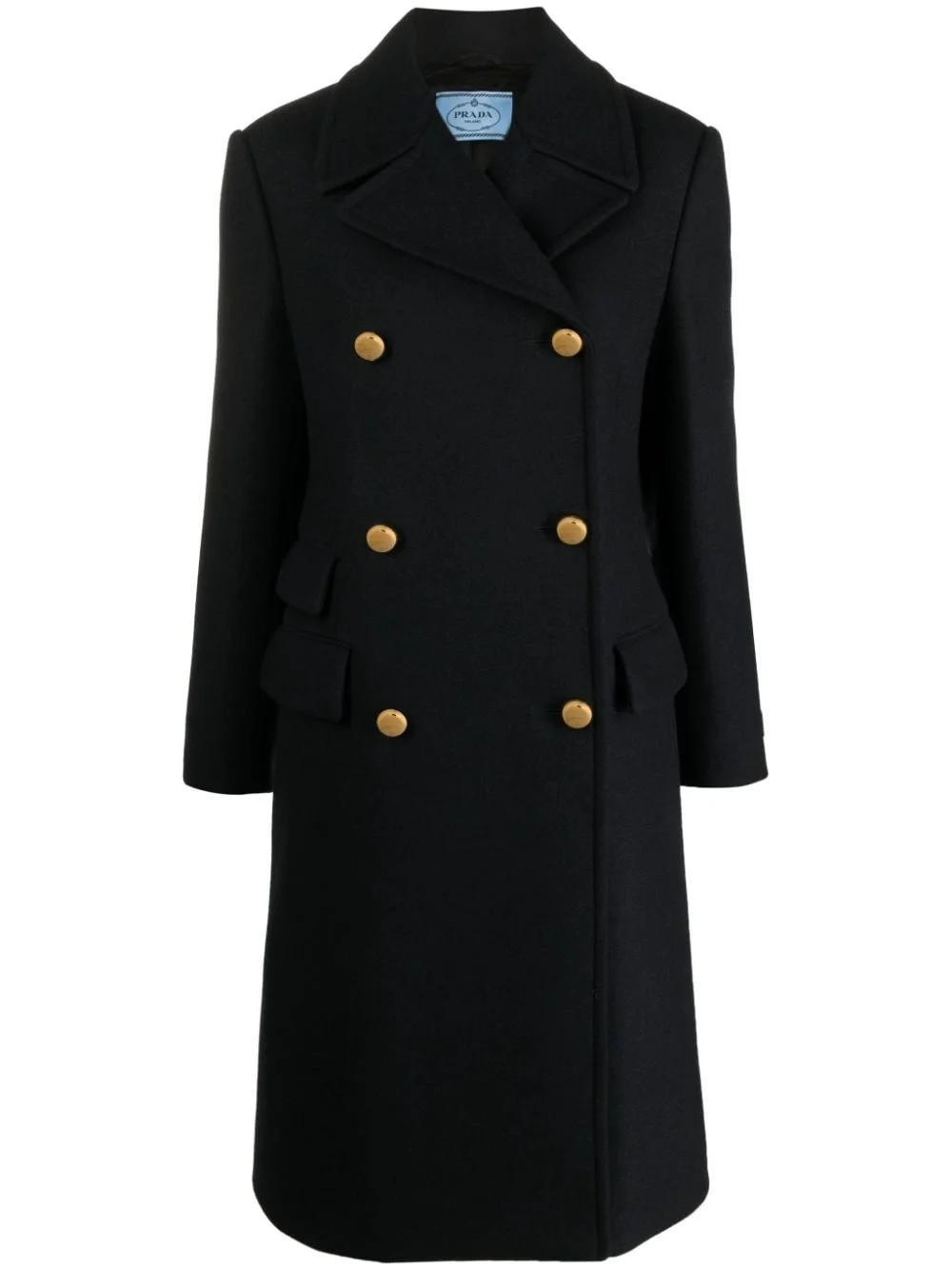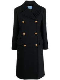 virgin wool double-breasted coat Spun from virgin wool, this Prada coat is tailored to a classic double-breasted silhouette. It's finished with notched lapels and a logo patch on the sleeve. Highlights - Navy blue - Virgin wool - Logo patch at the sleeve - Notched lapels - Double-breasted button fastening - Long sleeves - Two side flap pockets Composition Lining: Viscose 100%, Recycled Polyester 100% Outer: Virgin Wool 100% SIZE & FIT Model measurements Height 5 ft 10 in(1.78 m) Bust/Chest 30.7 in(78 cm) Hips 36.22 in(92 cm) Waist 25.59 in(65 cm) FittingInformation Designed to be unstructured, offering a loose fit throughout The internal shoulder pads offer a structured shape Made from a padded non-stretch fabric, giving it no natural elasticity This piece fits true to size – take your usual size Washing instructions Dry Clean Only