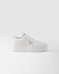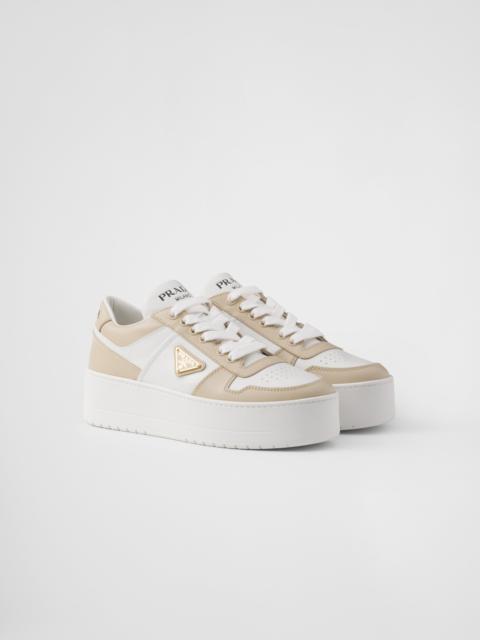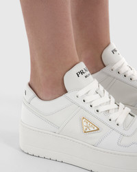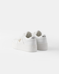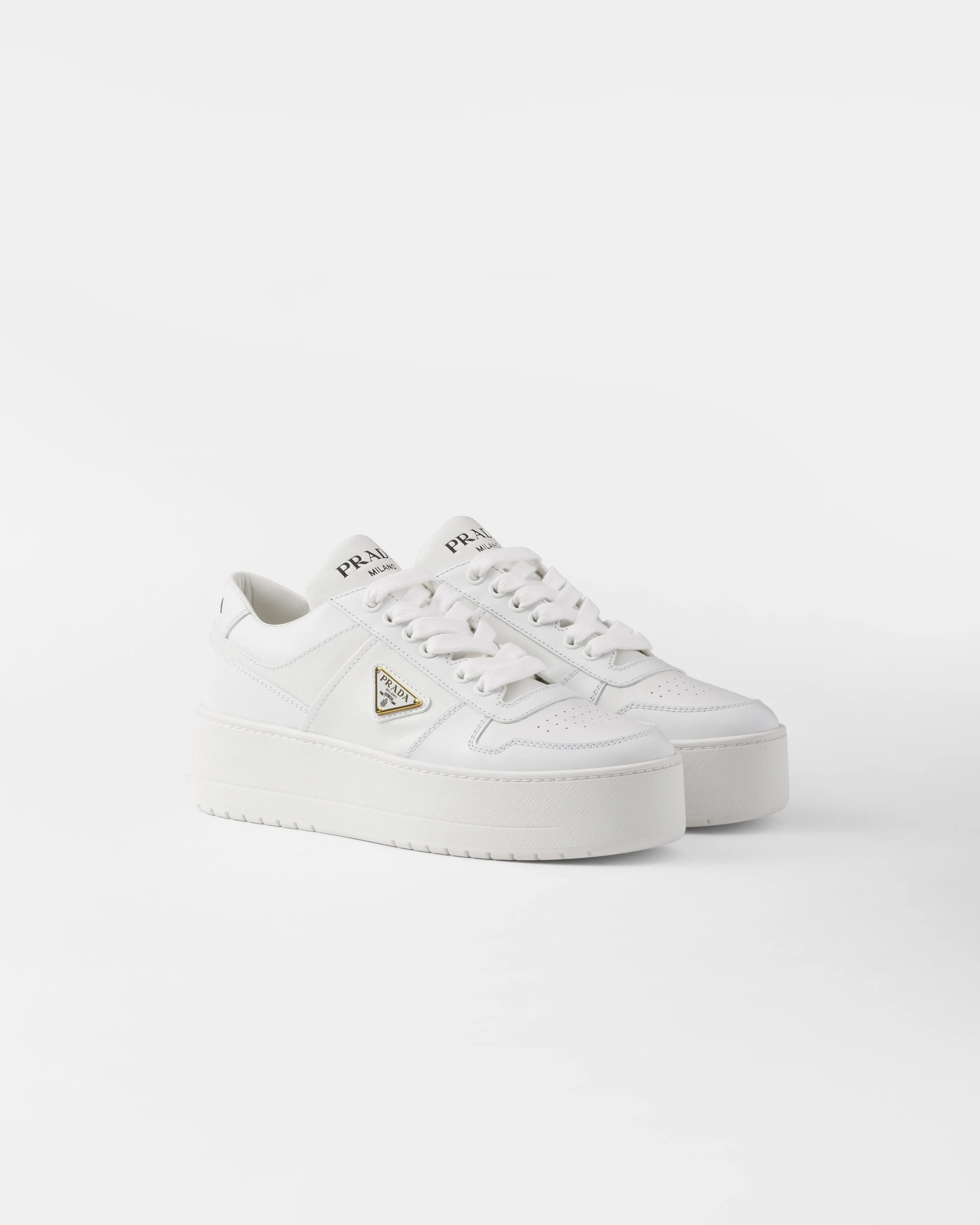 Inspired by basketball sneakers of the '80s, these Downtown Bold sneakers have a sporty design with refined details. The shoes made of perforated leather are reinterpreted with flatform soles that give the style a distinctive, contemporary character. Different interpretations of the Prada logo decorate the shoe, completed with the iconic geometric shape of the enameled metal triangle. - Product code: 1E792M_3LPF_F0009_F_050 - Upper with perforations - Leather lining - Enameled metal triangle logo - Laces closure - Rubber sole, 50 mm - Tread with geometric lines - Removable leather-covered insole - Imported MATERIALS Main material: Calfskin