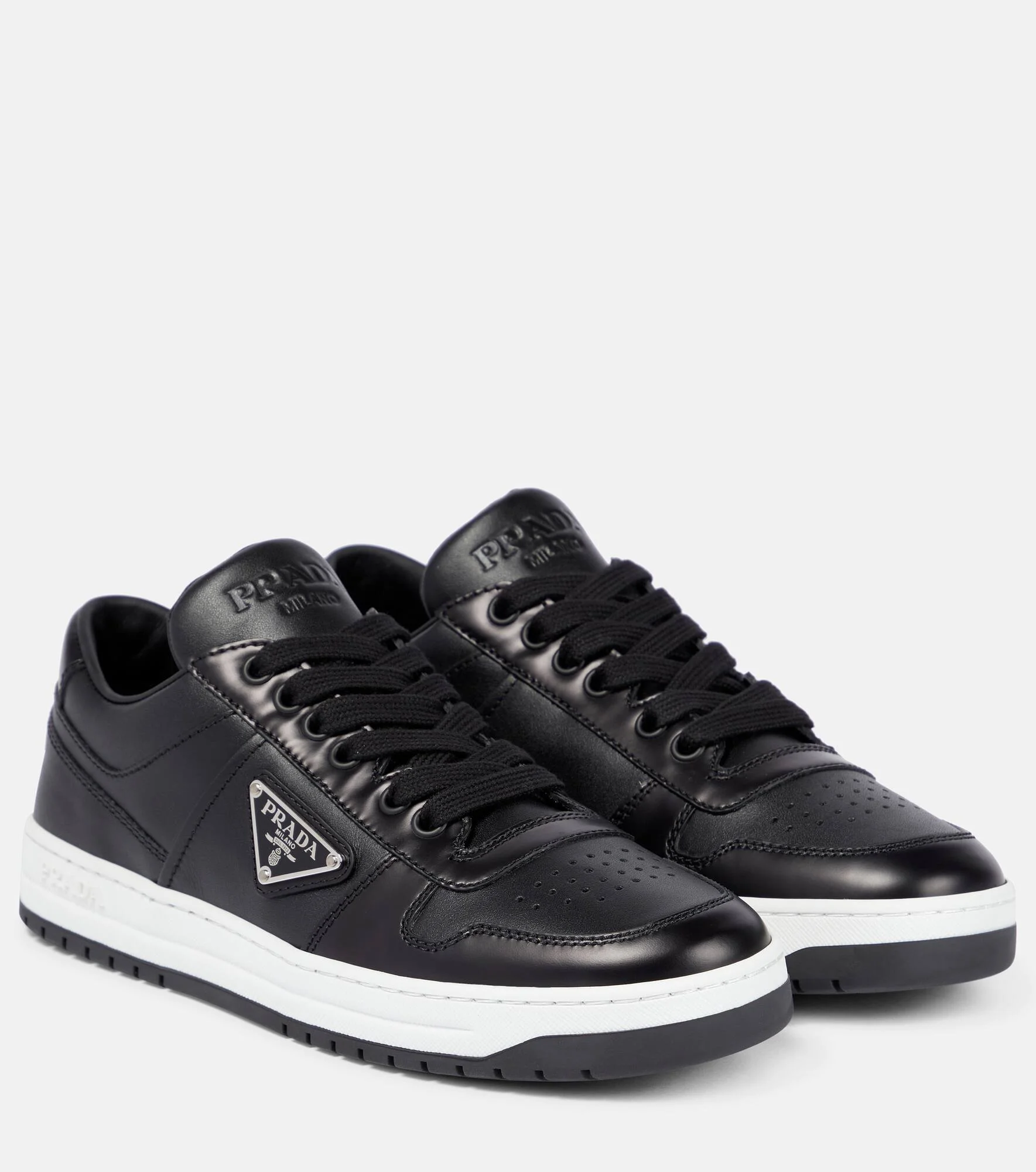 With signature branding on the uppers, tongues, heel tabs and embossed soles, the Downtown sneakers from Prada are an iconic streetwear style. They’re made in Italy from perforated leather. Product Details - Lining: leather, fabric - Sole: leather insole, rubber sole - Toe shape: round toe - Upper: calf leather - Comes with a box - Designer color name: Nero - Closure: lace-up - Made in Italy - Item number: P00637825 Size & Fit - True to size - Slightly narrow - European sizes - 2,5cm-1" platform (size EU 38) - 3cm-1" wedge heel (size EU 38)