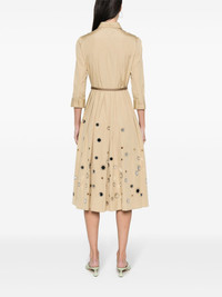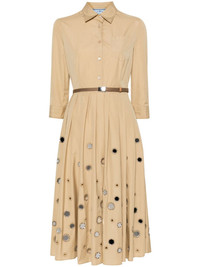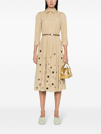 mirror embellished belted midi dress Highlights - Sand beige - Cotton - Poplin texture - Decorative stitching - Pleat detailing - Mirror embellishment - Classic collar - Half-length sleeves - Buttoned cuffs - Detachable waist belt - Mid-calf length - Unlined - Concealed side zip fastening Composition Cotton 100%, Viscose 92%, Polyester 8% SIZE & FIT Model measurements Height 5 ft 10 in(1.78 m) Bust/Chest 33.46 in(85 cm) Hips 36.22 in(92 cm) Waist 23.22 in(59 cm) FittingInformation Designed for a close fit at the chest and waist with a loose fit at the hip The belt offers adjustability for fitted preferences Made from a midweight non-stretch fabric This piece fits true to size – take your usual size Washing instructions Dry Clean Only