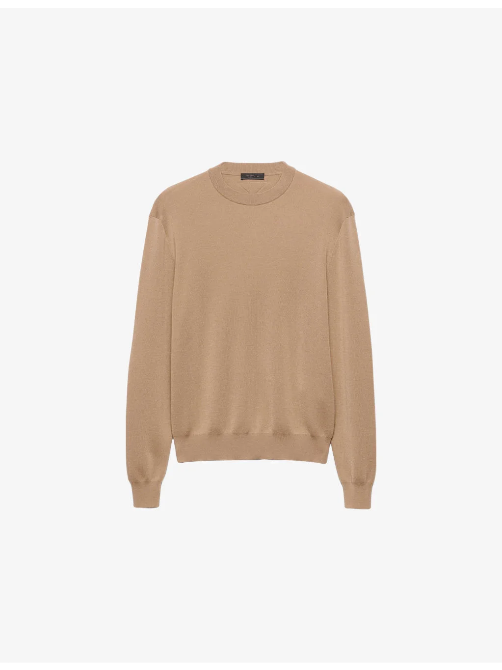 PRODUCT DETAILS - Prada cashmere jumper - 100% cashmere; contrast 100% suede - Regular fit, crewneck, long sleeves, fitted cuffs, tonal suede elbow patches, knitted triangle brand applique at back, ribbed trims to collar, cuffs and hem - Specialist dry clean only - Made in Italy - Model is 6ft 2in/1.88m and wears a size UK 38 - Lightweight, non-stretch Ref: R04513117