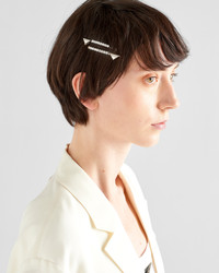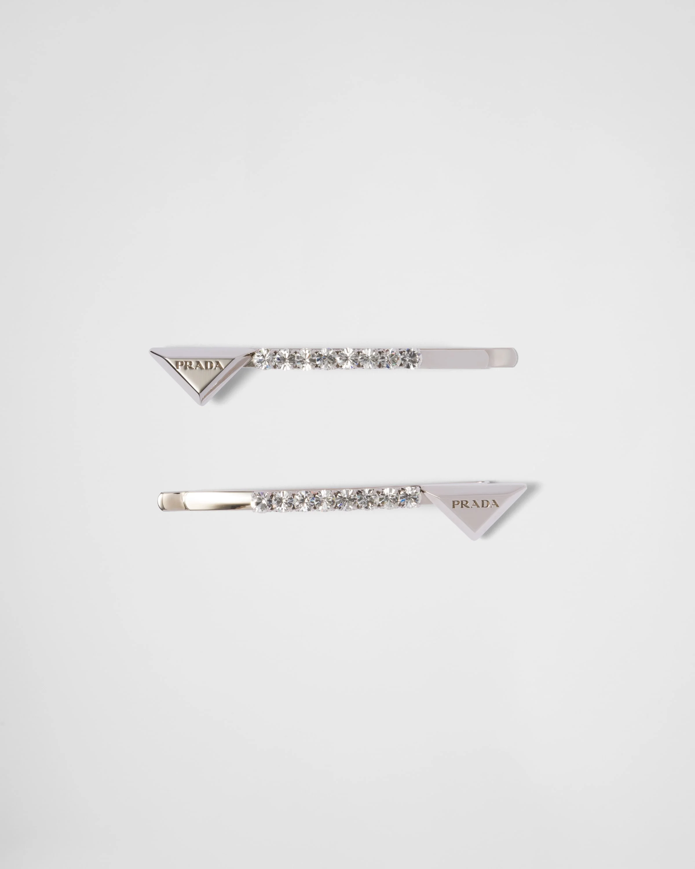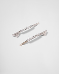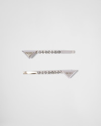Prada's historical triangle illuminated with sparkling crystals defines these brass hair accessories. Prada's historic code defines this pair of hair clips featuring the engraved lettering logo. - Product code: 1IF098_2CK4_F0OKL - With synthetic crystals - Sliding metal clip closure - Metal triangle logo - Imported MATERIALS Other Materials