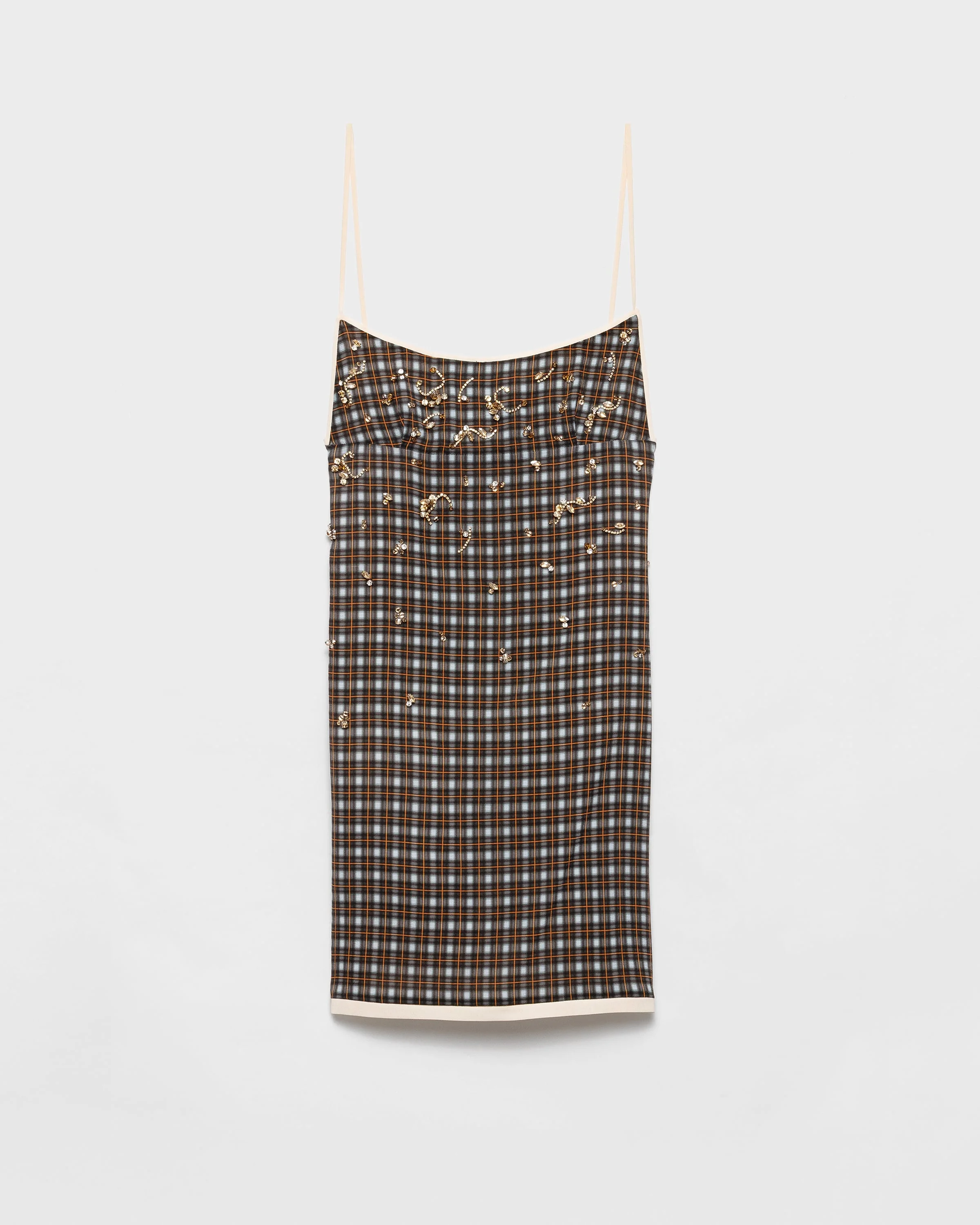 A harmonious blend of contrasting details defines this georgette mini-dress. The checked print gives the light silhouette casual style embellished with elegant, sparkling embroidery. - Product code: P3Q49R_178R_F0WS4_S_OOO - Straight fit - Lined - Scoop neck with spaghetti straps - Side zipper closure with hook - Sleeveless - Flared hem - Embellishments on the front and back - Imported - The model is 176 cm tall and wears a size 38 Height: 80cm MATERIALS Main material: 9% elastane 91% silk
