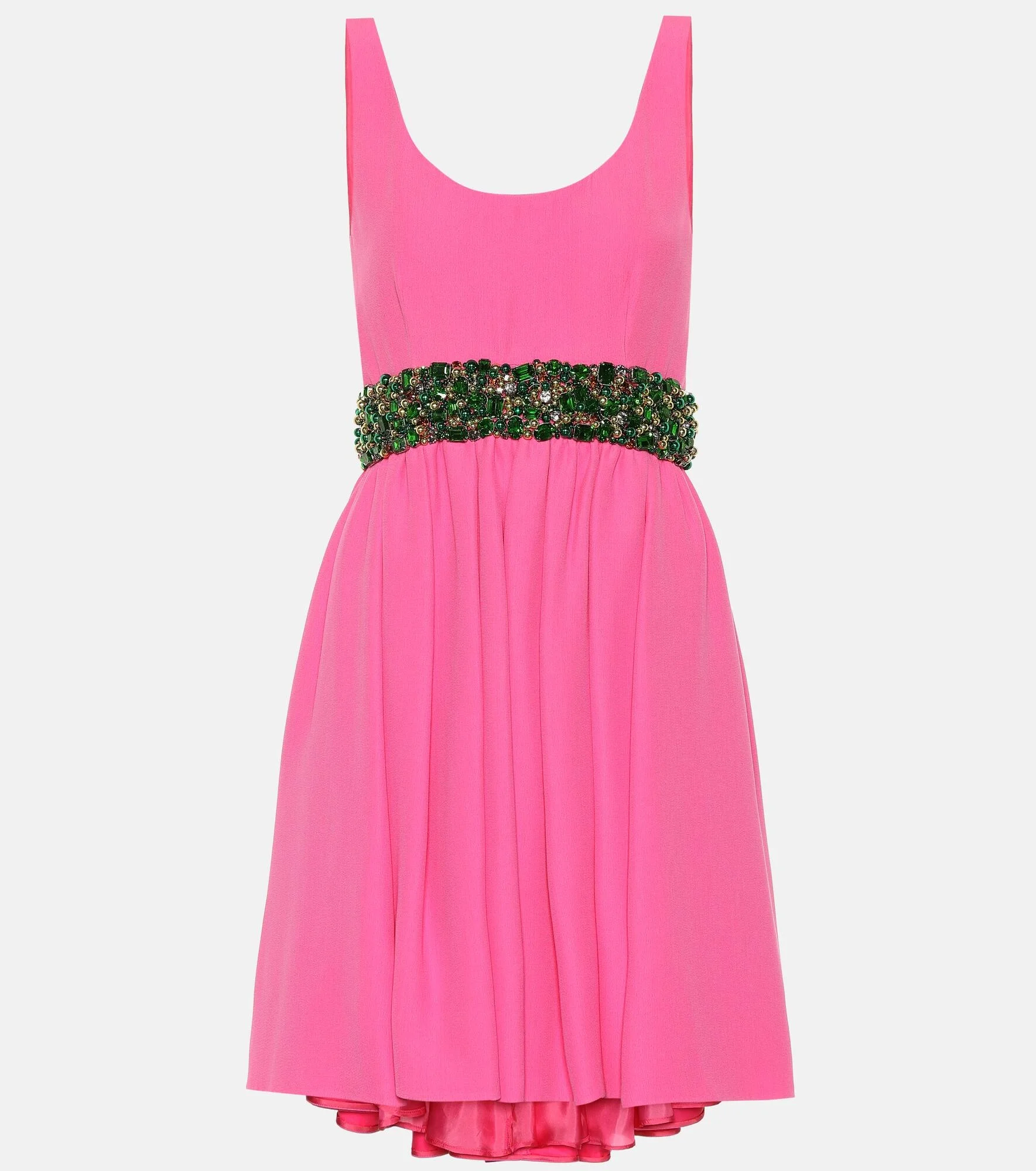Prada's passion for pink is getting us excited for summer garden parties and cocktails on rooftop bars in this embellished crepe minidress. Crafted in Italy, the sleeveless design has a low, scooping neckline that is echoed in the back, ruching at the waist which allows the flirty to skirt to have plenty of envy-inducing volume, and a highly embellished green band around the waist for added luxe. Wear yours with towering heels and carry just a clutch for poised perfection. Product Details - Lining: fully lined, 60% cupro, 40% silk - Made in Italy - Closure: zipper, hook fastening, zipped back - Designer color name: Pink - Material: 100% viscose - Care instructions: dry clean - Item number: P00363981 Size & Fit - Fits large to size - we recommend trying one size smaller - Low back - Cinched waist - The model seen in the picture is 178cm-5'10" and wearing a size IT 40