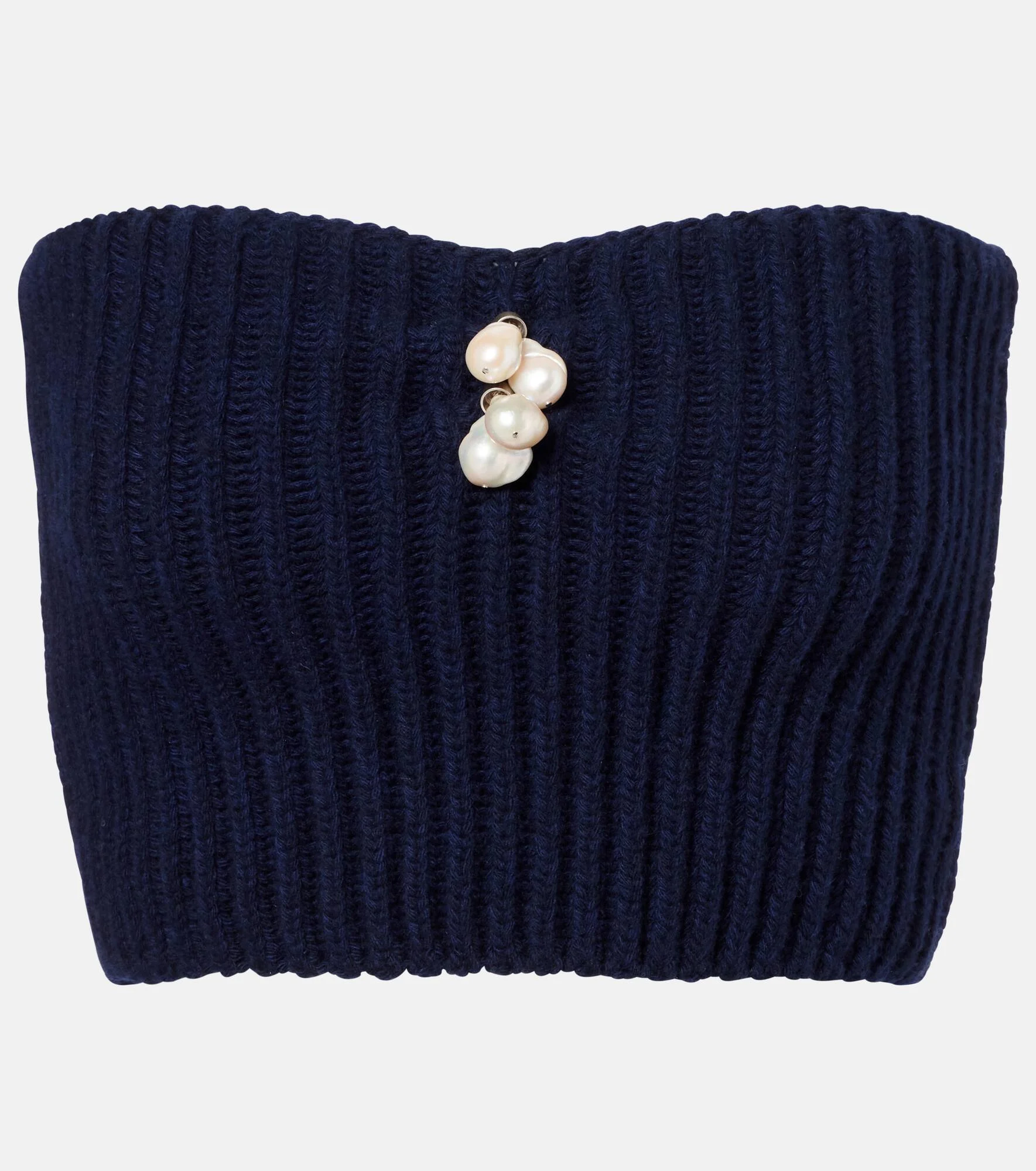Prada takes Italian heritage into a distinctly modern direction with a streamlined and fashion-forward approach. Ribbed-knit from wool and cashmere, this crop top features faux pearl embellishments dangling from the center of the neckline. Product Details - Material: 70% wool, 30% cashmere - Care instructions: dry clean - Made in Italy - Designer color name: Blue - Item color: blue - Contains non-textile parts of animal origin - Closure: invisible zipper - Item number: P01117251 Size & Fit - True to size - Strapless - Fitted - Stretchy fabric - Cropped - The model seen in the picture is 178cm-5'10" and wearing a size IT 40