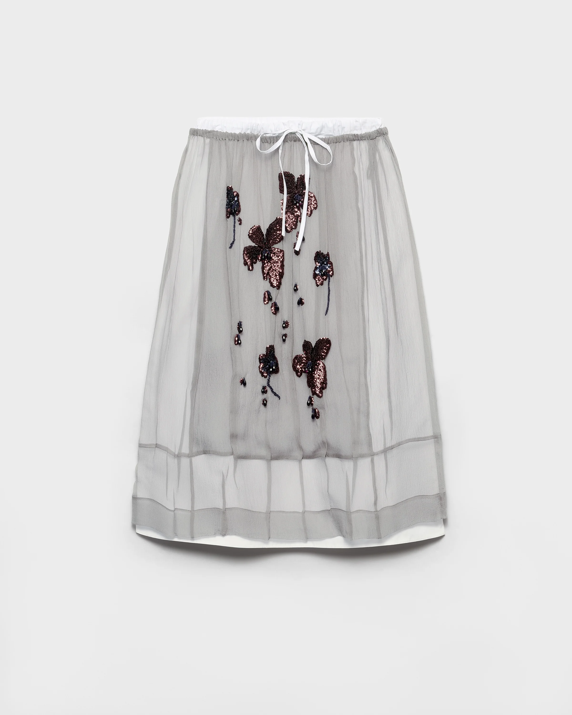 This skirt that blends layering and delicate contrasts expresses an intimate style and innate elegance. The lightweight silk chiffon silhouette is embellished with shimmering floral embroidery that adds a romantic touch. - Product code: P172ZR_18QL_F0024_S_OOO - Pencil silhouette - Garment with slip - Side zipper closure with hook - Sequined floral embroidery - Imported - The model is 178 cm tall and wears a size 38 Height: 65cm MATERIALS Main material: 100% silk