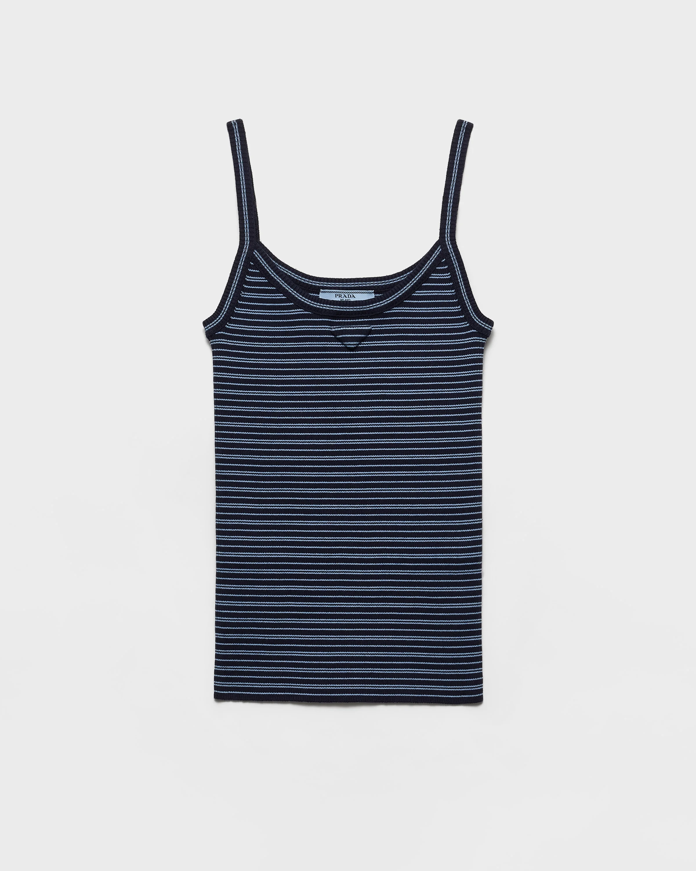 This cotton top is a refined interpretation of a summer classic for everyday looks. The stripe motif enhances the slim-fit silhouette with narrow shoulder straps and scoop neck, completed by the tonal triangle logo. - Product code: P29C07_19C7_F0OBM_S_OOO - Ribbed knit - Slim-fit - Knit triangle logo - Imported - The model is 178 cm tall and wears a size 38 Height: 64cm MATERIALS Main material: 100% Cotton