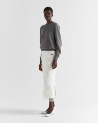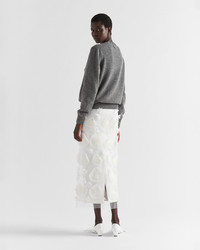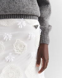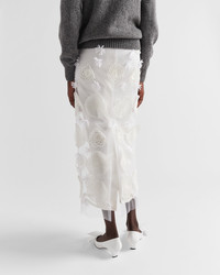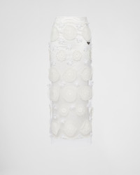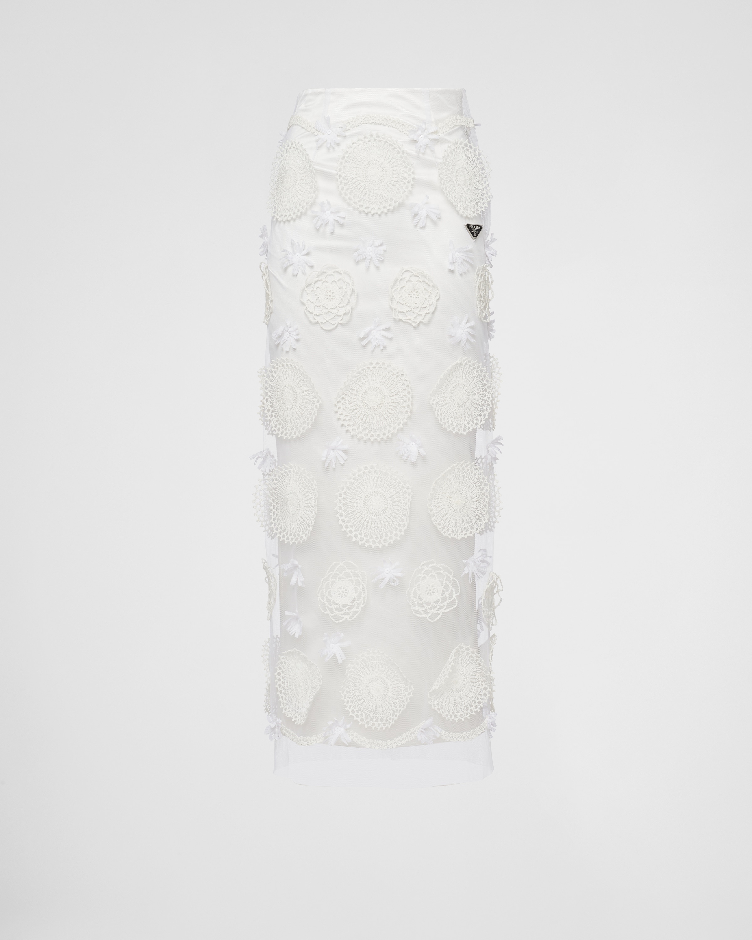 The Fall Winter 2023 collection explores new and unexpected beauty created with refined lines. Sophisticated details reinterpret the maxi-skirt in duchesse, transforming a wardrobe classic into a stunning design. The sophisticated silhouette is softened by layering and delicate fabrics embellished with hand-embroidered flowers. The enameled metal triangle logo completes the elegant and romantic garment, adding an iconic touch. - Code du produit: P165XR_13RB_F0009_S_232 - Straight fit - Back slit - Side zipper and hook closure - Enameled metal triangle logo - Large roses hand-embroidered on the tulle overlay - Importe Taille: 95cm MATERIALS Silk