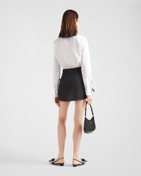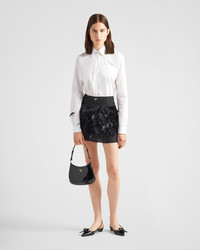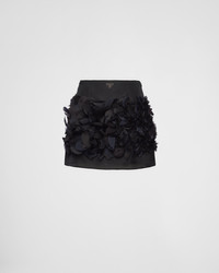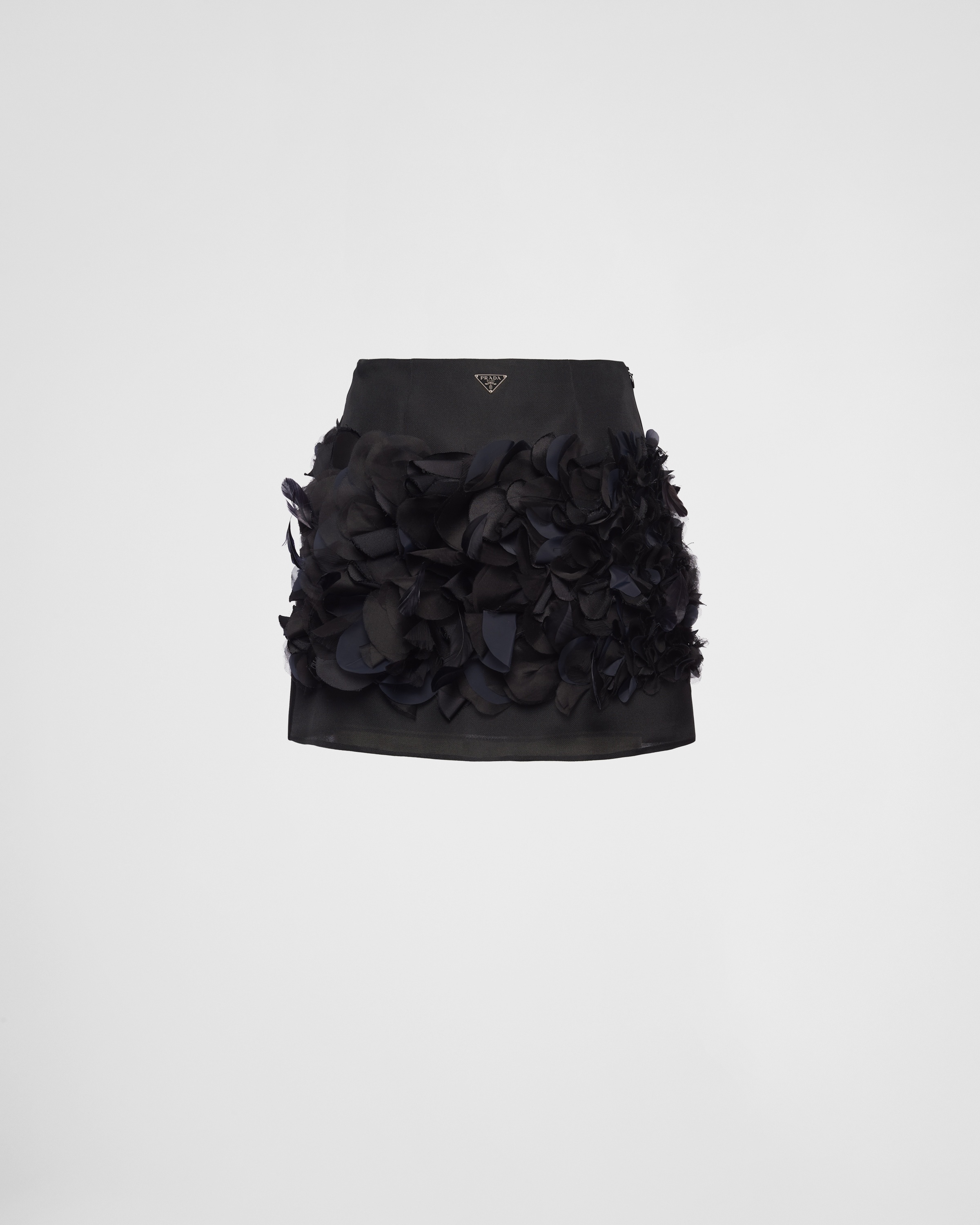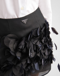 Delicate transparencies define the geometric design of this gazar miniskirt. Playing with sleek lines and unexpected combinations, the garment with a slightly flared silhouette is decorated on the front by the fluffy feather and fabric petal embellishment. The enameled metal triangle logo completes the sophisticated garment with its iconic signature. - Product code: P109JR_1322_F0002_S_OOO - Straight fit - Garment with slip - Side zipper and hook closure - Enameled metal triangle logo - Imported - The model is 180 cm tall and wears a size 38 Height: 38cm MATERIALS Silk