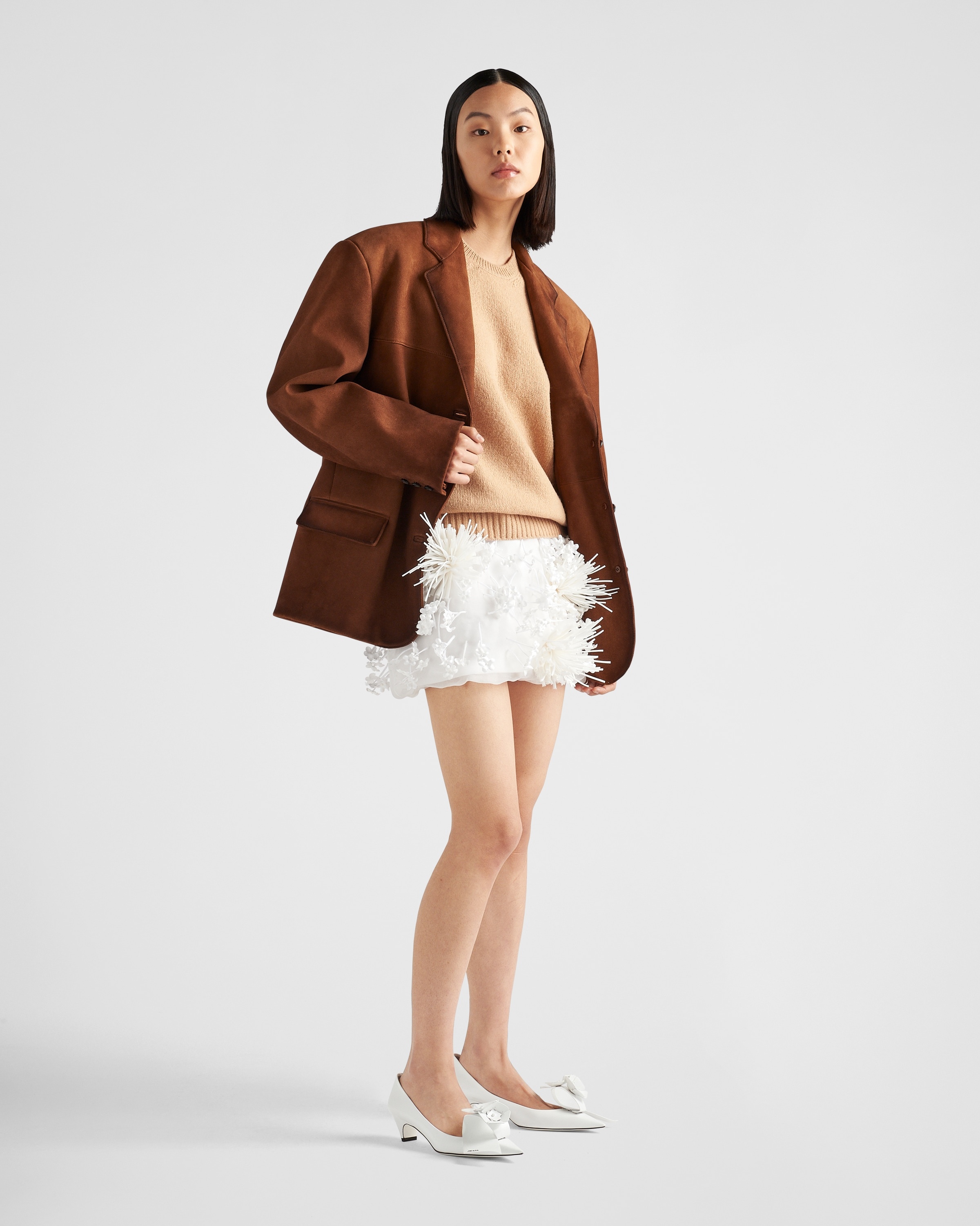 The Fall Winter 2023 Collection explores new forms of beauty, combining everyday clothing and formal apparel in hybrid designs with unexpected charm. Straight, clean lines define this satin and organza miniskirt with romantic, contemporary charm. The minimalist silhouette is animated by floral appliqués that add dimension, revolutionizing the sophisticated garment with a delicate, precious touch. The enameled metal triangle logo completes the look, adding an iconic note. - Codice articolo: P158XR_13QW_F0009_S_232 - Straight fit - Lined garment - Side zipper and hook closure - Enameled metal triangle logo - Hand-embroidered fabric flowers - Importato - The model is 177 cm tall and wears a size 38 - altezza: 38cm