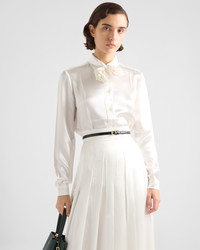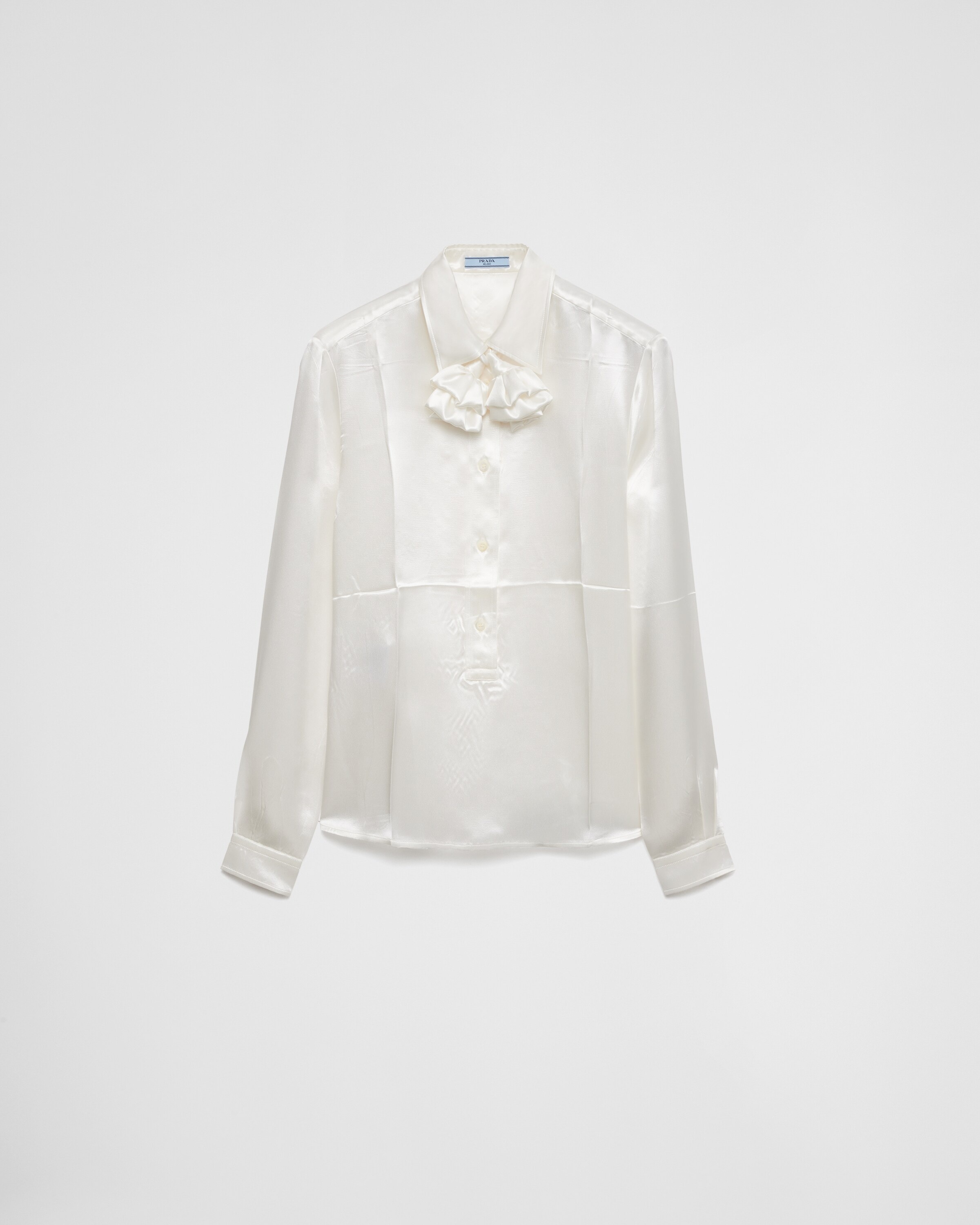 The refined elegance of satin gives this classic cut shirt sophisticated allure. Soft tonal floral appliques embellish the collar, adding a romantic touch. - 제품 코드: P406IR_16ZF_F0009_S_OOO - Boxy fit - Classic collar with appliques - Front button closure - Sleeves with shirt cuffs - Sartorial logo label - 가져오기 - The model is 177 cm tall and wears a size 38 높이: 64cm MATERIALS 주 소재: 54% acetate 46% viscose