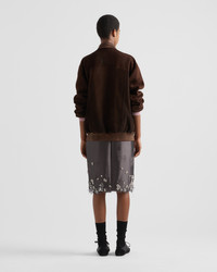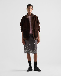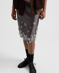 Prada's multifaceted identity combines different and often contrasting styles and meanings, creating unexpected harmonies. This silk and wool skirt is defined by the combination of shimmering embroidery, feminine details, and distressed touches with contemporary charm. - Product code: P181YR_16L8_F0031_S_OOO - Pencil silhouette - Lined garment - Side zipper closure with hook - Embroidery detail - Imported - The model is 178 cm tall and wears a size 38 Height: 70cm MATERIALS Main material: 52% silk 48% wool