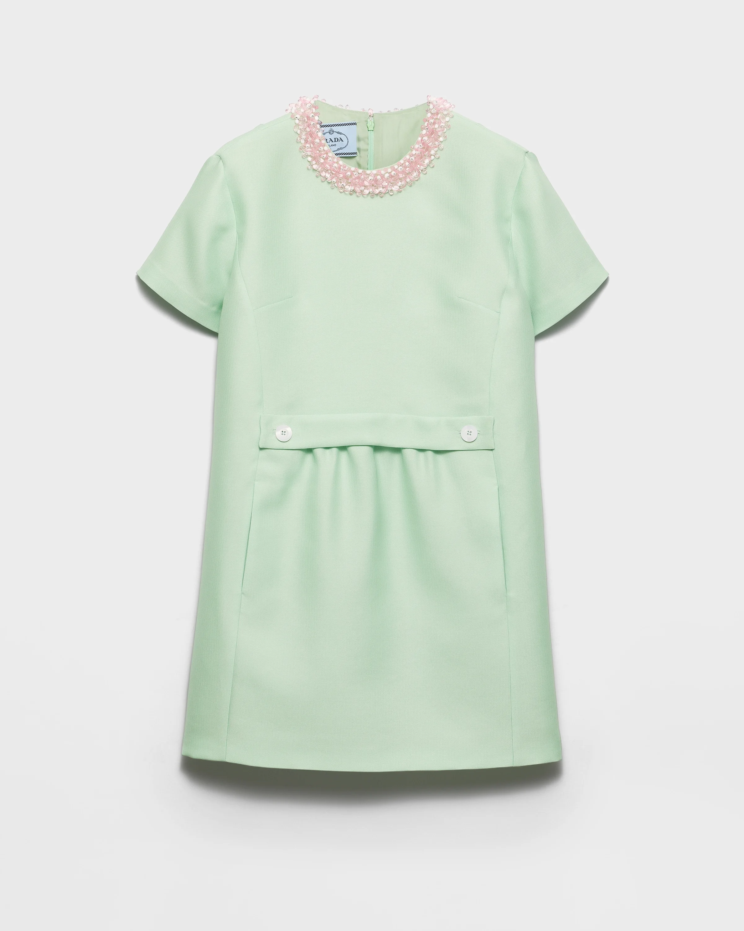 This dress with natural elegance has a loose silhouette that falls freely and is embellished with embroidered details. In the new Prada collection, dresses are freed from the superfluous to reveal meaningful simplicity and become flexible, vibrant, and in a continuous dialog with the wearer and present moment. - Product code: P3S41R_19RZ_F0194_S_OOO - Loose fit - Lined - Embroidered round neck - Lined - Back zipper closure - Short sleeves - Straight hem - Imported - The model is 180 cm tall and wears a size 38 Height: 87cm MATERIALS Silk