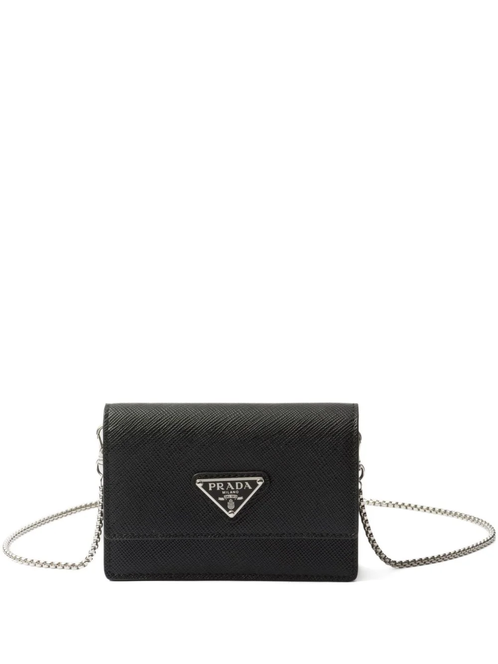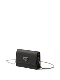 Saffiano leather mini bag Highlights - Black - Foldover top with press-stud fastening - Detachable chain-link shoulder strap - Enamel triangle logo - This piece comes complete with a protective dust bag. Composition Outer: CALFSKIN 100% SIZE & FIT Measurement DEPTH 0.98 in(2.5 cm) HEIGHT 3.14 in(8 cm) WIDTH 4.52 in(11.5 cm)