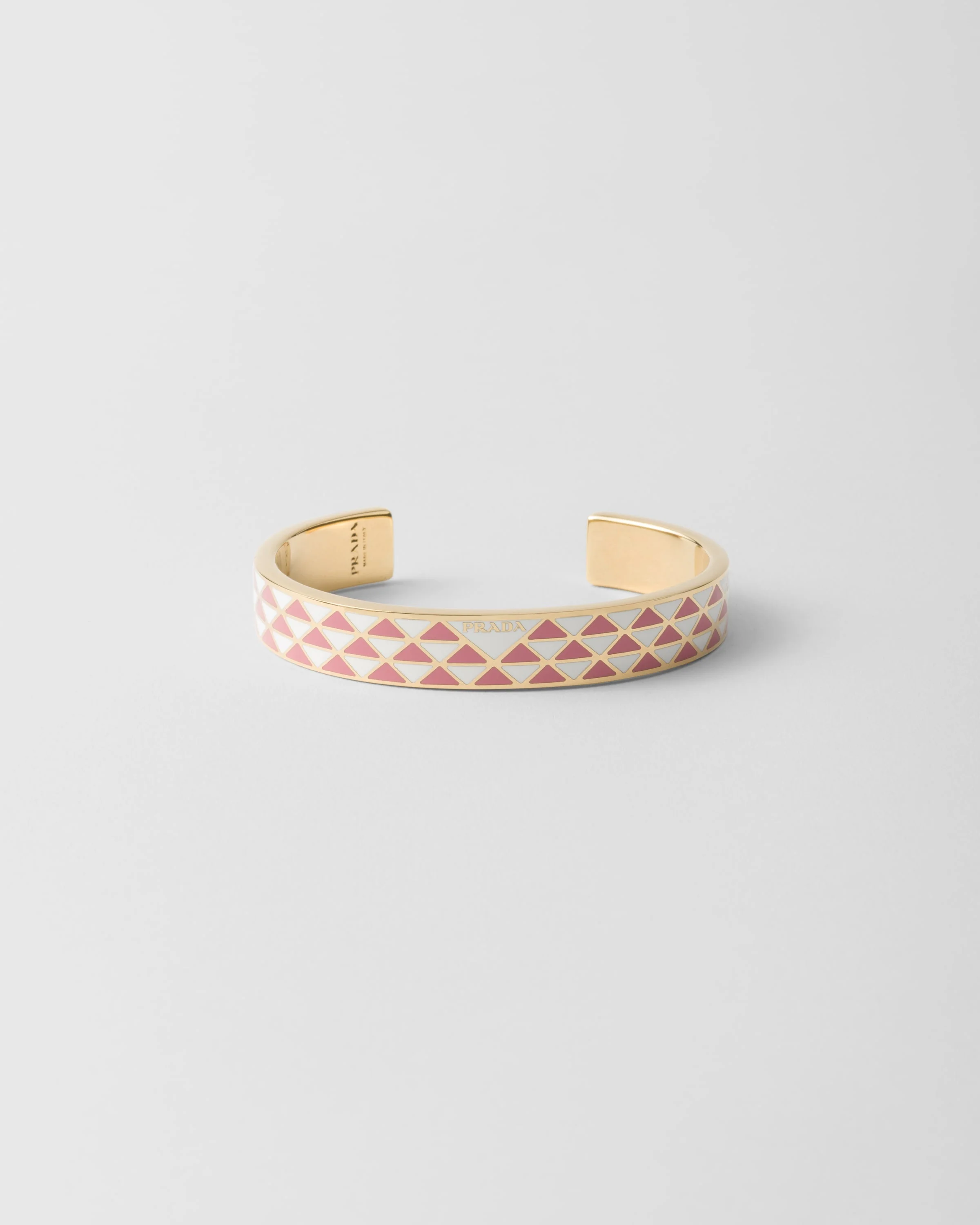 The iconic triangle, the distinctive signature of Prada collections, is transformed into a geometric pattern that embellishes this enameled metal bracelet. The accessory with sleek, contemporary lines is decorated with the lettering logo that completes the bangle design with an iconic note. - Product code: 1IB846_2CO2_F03NU - Enameled logo - Imported Height: 1.1cm MATERIALS Other Materials