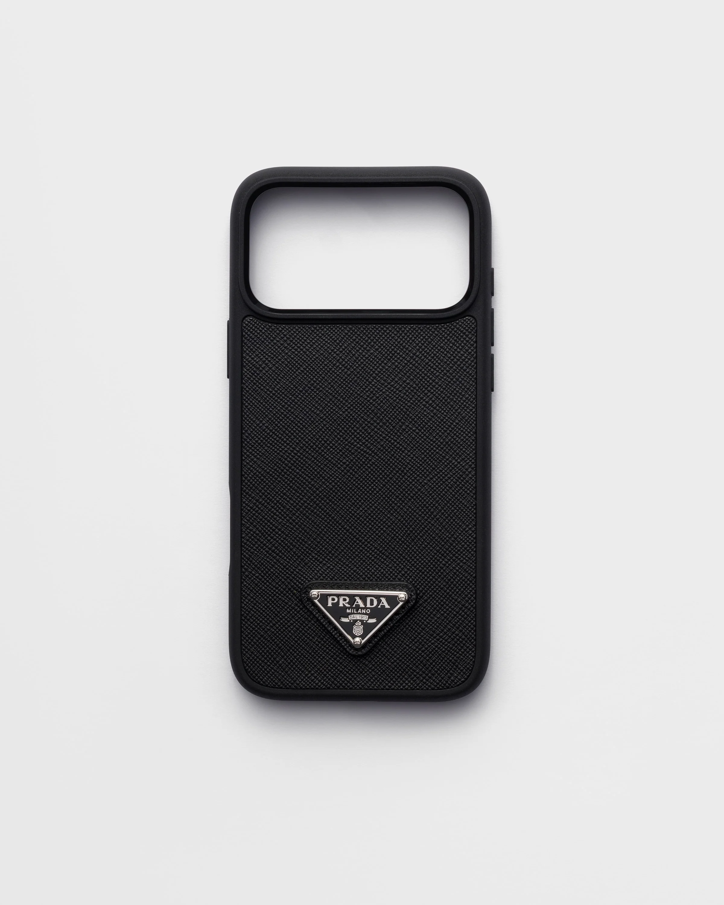 This Saffiano leather case for the iPhone 17 Pro Max has a sleek and sophisticated design decorated with the emblematic enameled metal triangle logo. - Product code: 1ZH222_QHH_F0632 - Enameled metal triangle logo - Imported MATERIALS Main material: Calfskin