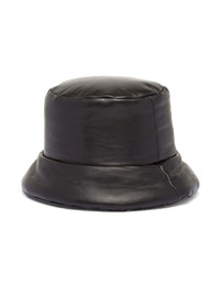 enamelled-logo nappa leather bucket hat Part of Prada's renowned Re-Nylon line, 'entirely crafted from a regenerated nylon created through the recycling and purification of plastic', this black bucket hat draws inspiration from streetwear-inspired silhouettes. Made in Italy from supple calf leather, the design is padded for a voluminous silhouette whilst a signature triangle logo plaque adorns the front. Highlights - Black - Nappa leather - Enamel triangle logo - Padded design - Flat crown - Dropped narrow brim Composition Nappa Leather 100%
