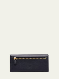 Prada wallet in textured calf leather Envelope flap top with snap closure Center zip compartment divides interior; six card slots, one slip pocket, and leashed ID window slot Exterior, back zip pocket Approx. 6.2"H x 8"W x 3.7"D Made in Italy