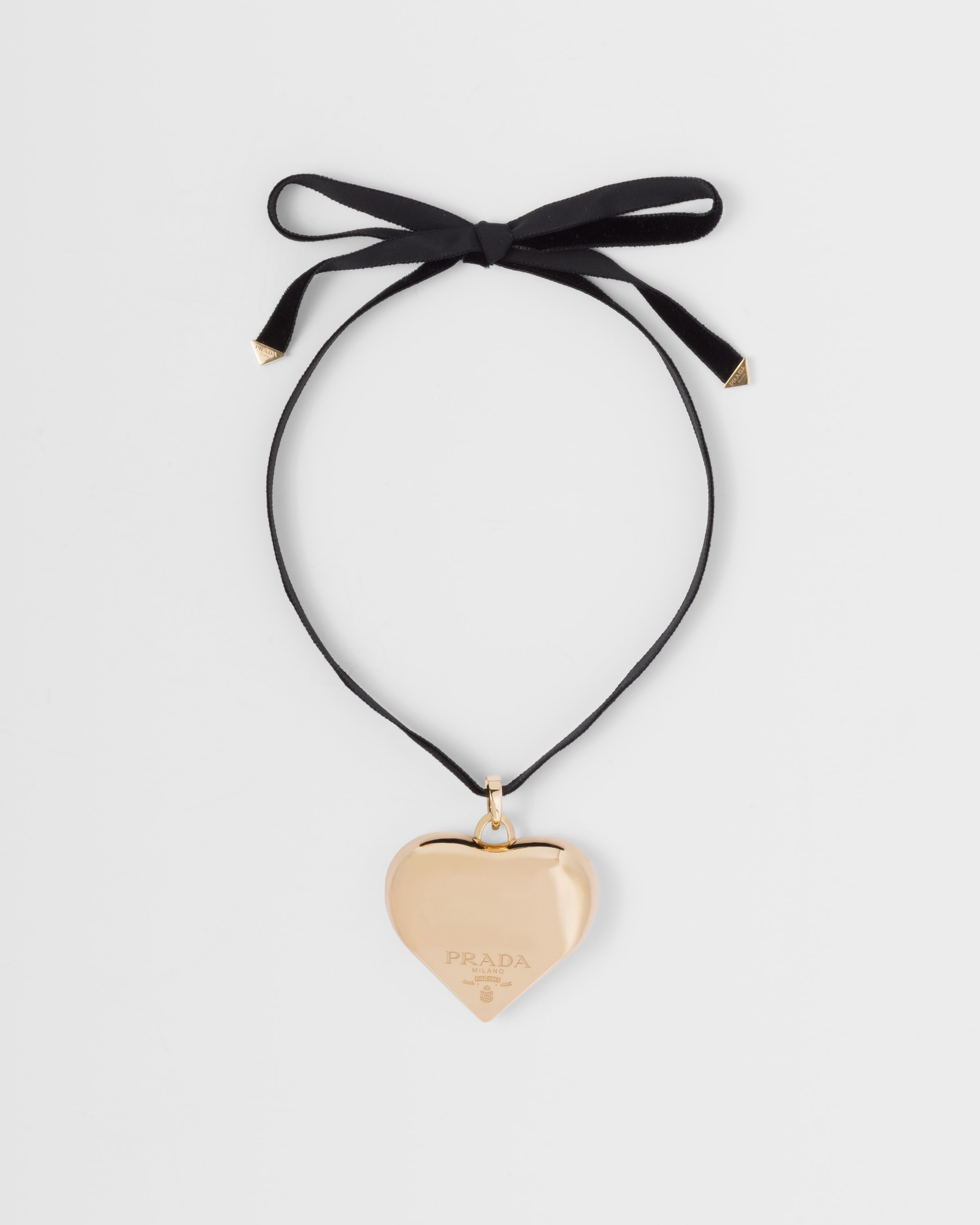 An unexpected aesthetic combination mixes the expressiveness of pop art and industrial forms, giving life to the new interpretation of one of the universal symbols of love. The heart, presented here as an oversized pendant in recycled yellow gold with a bold, sophisticated silhouette, is paired with a lustrous velvet ribbon for the brand's fine jewelry collection. The full, rounded shape of the top and the geometric lines of the triangle on the bottom of the heart create an unexpected mix. - 商品代號: 1JCA29_2DA5_F0056 - 750 Yellow Gold (18 kt) - Visible logo - Velvet ribbon with gold triangle tips - Length: 160 cm (62.99 inches) - Made in Italy - Each step of Prada's responsible gold and diamond production chain is verified and traceable thanks to Aura Blockchain technology. - 進口