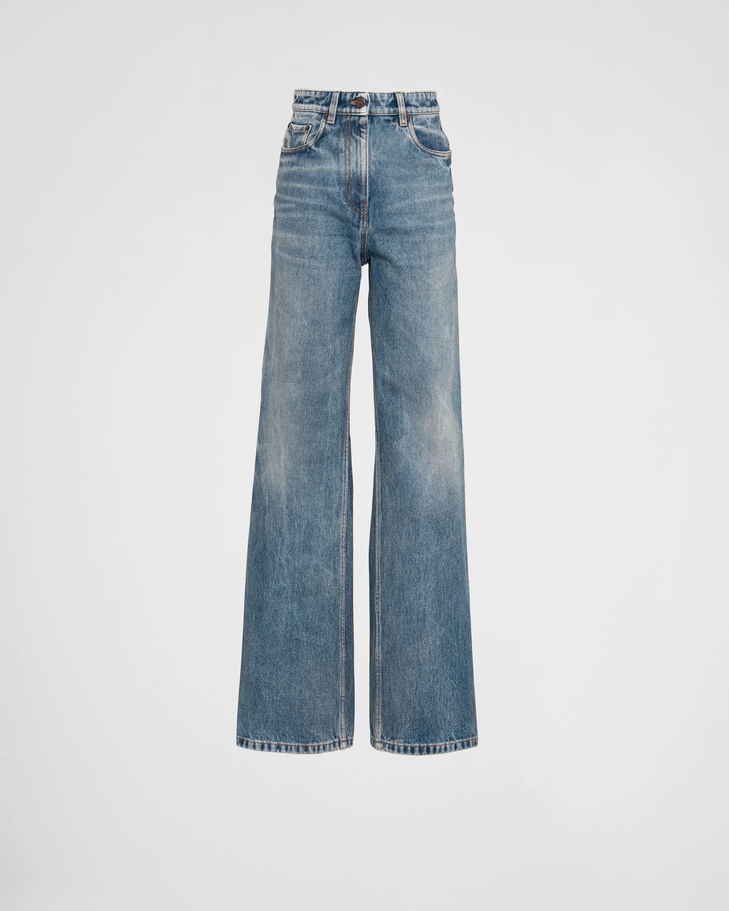 These sleek, modern high-rise denim jeans are characterized by the contrasting top-stitching and the bleached denim that gives the garment a vintage look. The enameled metal triangle logo stands out on the back. - Product code: GFP492_12O0_F0BAU_S_231 - Bleached denim - Menswear fit - High-rise waist - Hem width: 26 cm, Size: 25 - Zipper fly with button - Contrasting top-stitching - Curved front pockets with coin pocket - Back patch pockets - Total length 118cm, Size 25 - Triangle logo - Imported - The model is 178 cm tall and wears a size 38 Height: 118cm MATERIALS Main material: 100% cotton