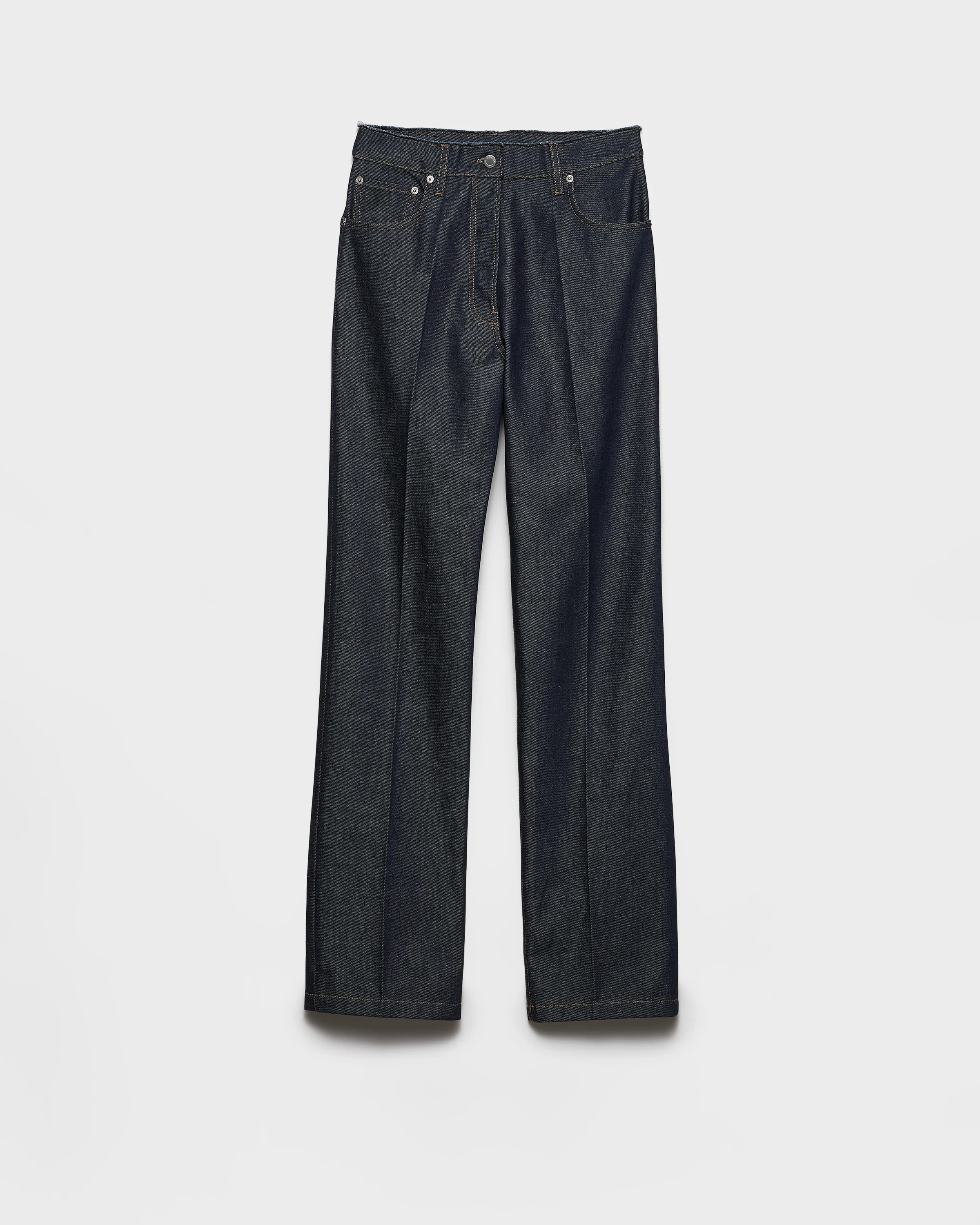 A timeless classic elevated with details: raw denim, contrasting top-stitching, a precise construction. The regular fit accompanies movements with natural elegance, while the Prada Milano leather patch establishes an iconic authenticity. - Product code: GFP540_18MD_F0008_S_OOO - Raw denim treatment - Classic fit - Regular waist - Hem width: 22 cm, Size:25 - Button fly - Contrasting stitching - Total length: 114 cm, Size: 25 - Prada Milano leather label on the back - Pressed garment - Imported - The model is 180 cm tall and wears a size 38 Height: 114cm MATERIALS Main material: 100% Cotton