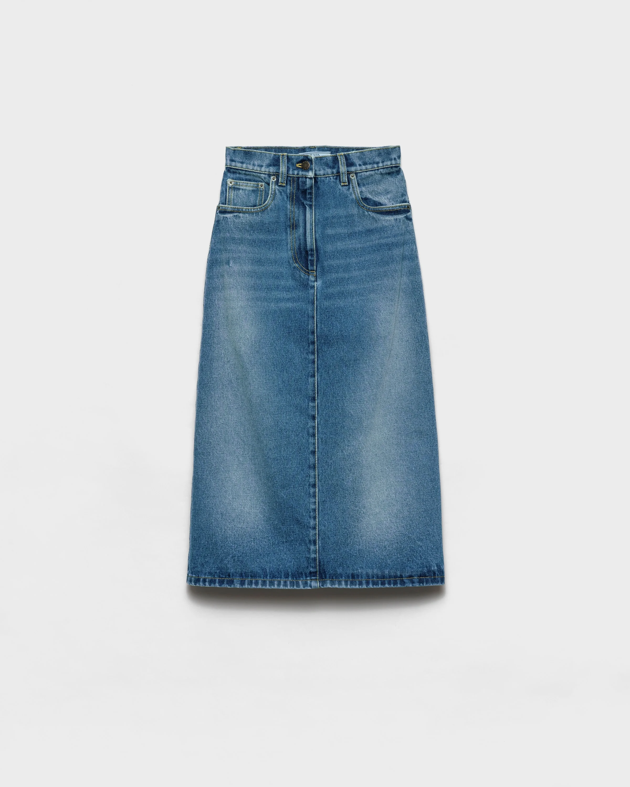 Unmistakable details and vintage touches define this skirt with a casual style made of denim with a worn effect, flared silhouette and completed by a back slit. - Product code: GFD176_16PK_F0V3N_S_OOO - Used denim treatment - Unlined garment - Regular waist - Zipper fly with button - Contrasting top-stitching - Center-back length: 81 cm, Size: 38 - Prada Milano logo label on the back - Imported - The model is 180 cm tall and wears a size 38 Height: 81cm MATERIALS Main material: 100% cotton
