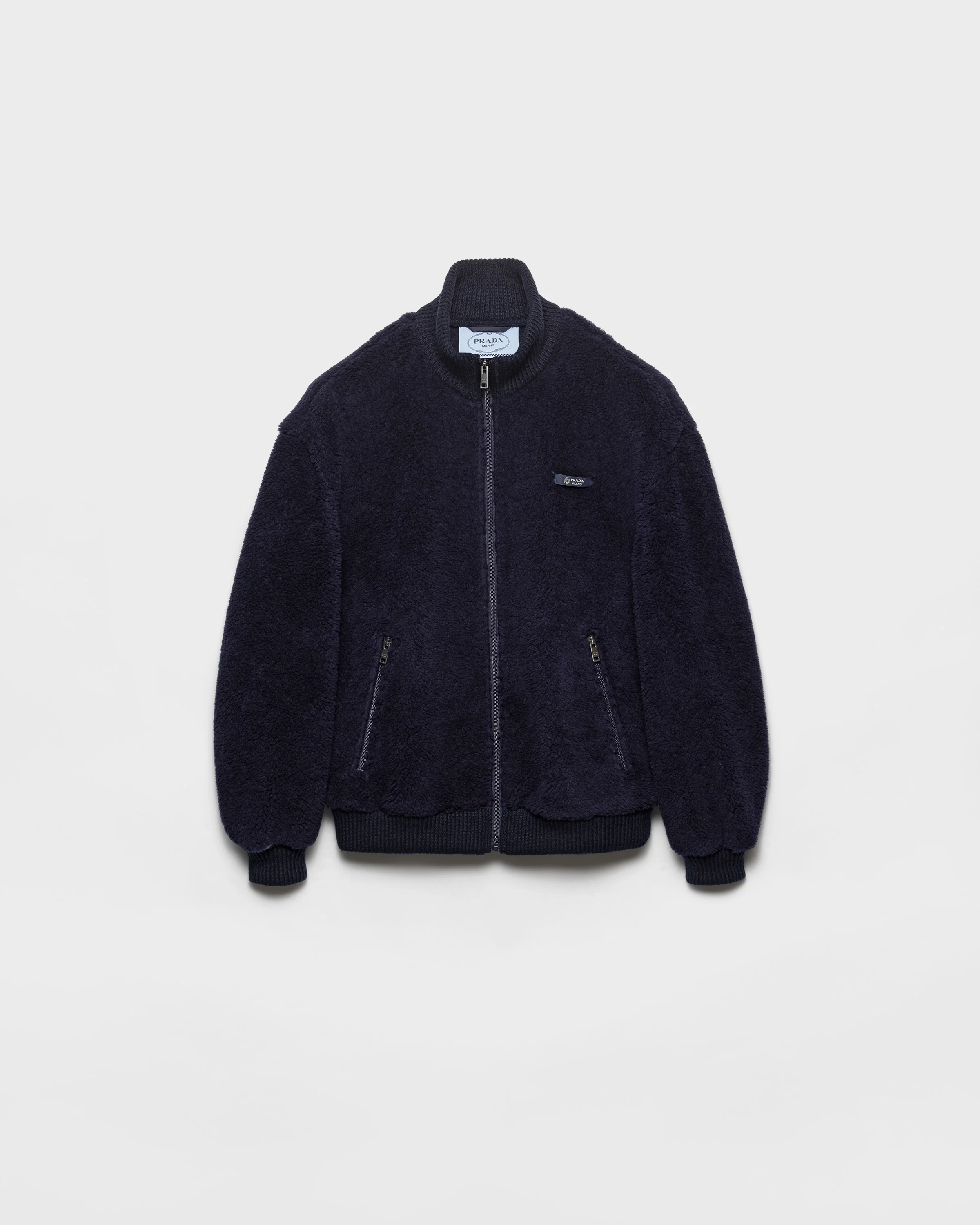 Warmth and lightness are reinterpreted with Prada style. Clean lines, ribbed knit cuffs and discreet logo transform this jacket into an iconic garment. - Product code: 292343_17VA_F0124_S_OOO - Lined - Ribbed knit collar - Long sleeves - Ribbed knit cuff - Zipper closure - Zipper pockets - Sartorial logo label - Imported - The model is 180 cm tall and wears a size 38 Height: 66cm MATERIALS Main material: 48% polyamide 52% virgin wool