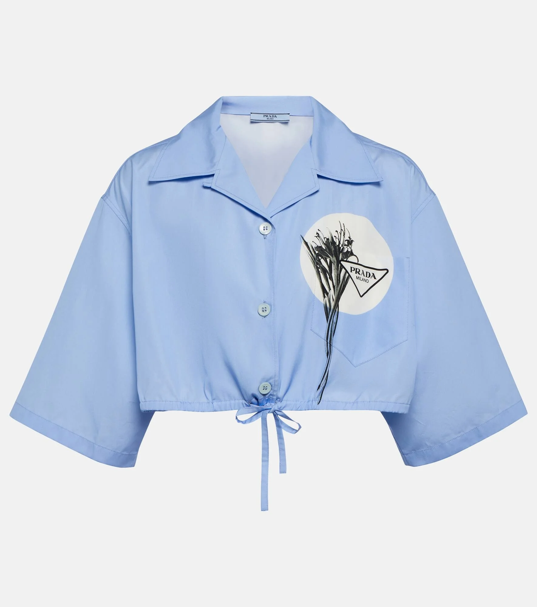 This cropped shirt from Prada is a whimsical take on sporty silhouettes. It's made rom crisp cotton and features a minimalist floral print at the chest. Pair it with the label's matching pencil skirt. Product Details - Made in Italy - Closure: buttoned front - Drawstring waist - Designer color name: Celeste - Care instructions: dry clean - Pockets: breast pocket - Material: 100% cotton - Item number: P00635340 Size & Fit - True to size - Dropped shoulders - Loose fit, drawstring waist - Cropped - The model seen in the picture is 178cm-5'10" and wearing a size IT 40