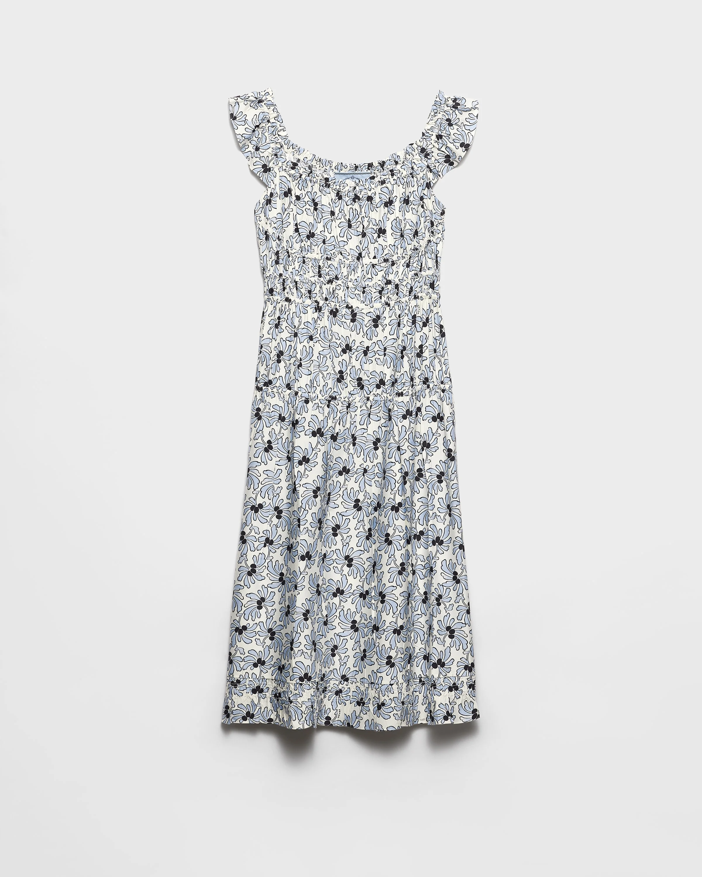 This light, feminine ponge dress has a flared silhouette and romantic details. The floral print brightens the style defined by the draped bodice and refined square neckline with ruffles. - Product code: P3R68H_19B0_F0076_S_OOO - Flowers print - Flared fit - Unlined garment - Square neckline - Sleeveless - Flared hem - Imported - The model is 181 cm tall and wears a size 38 Height: 120cm MATERIALS Viscose