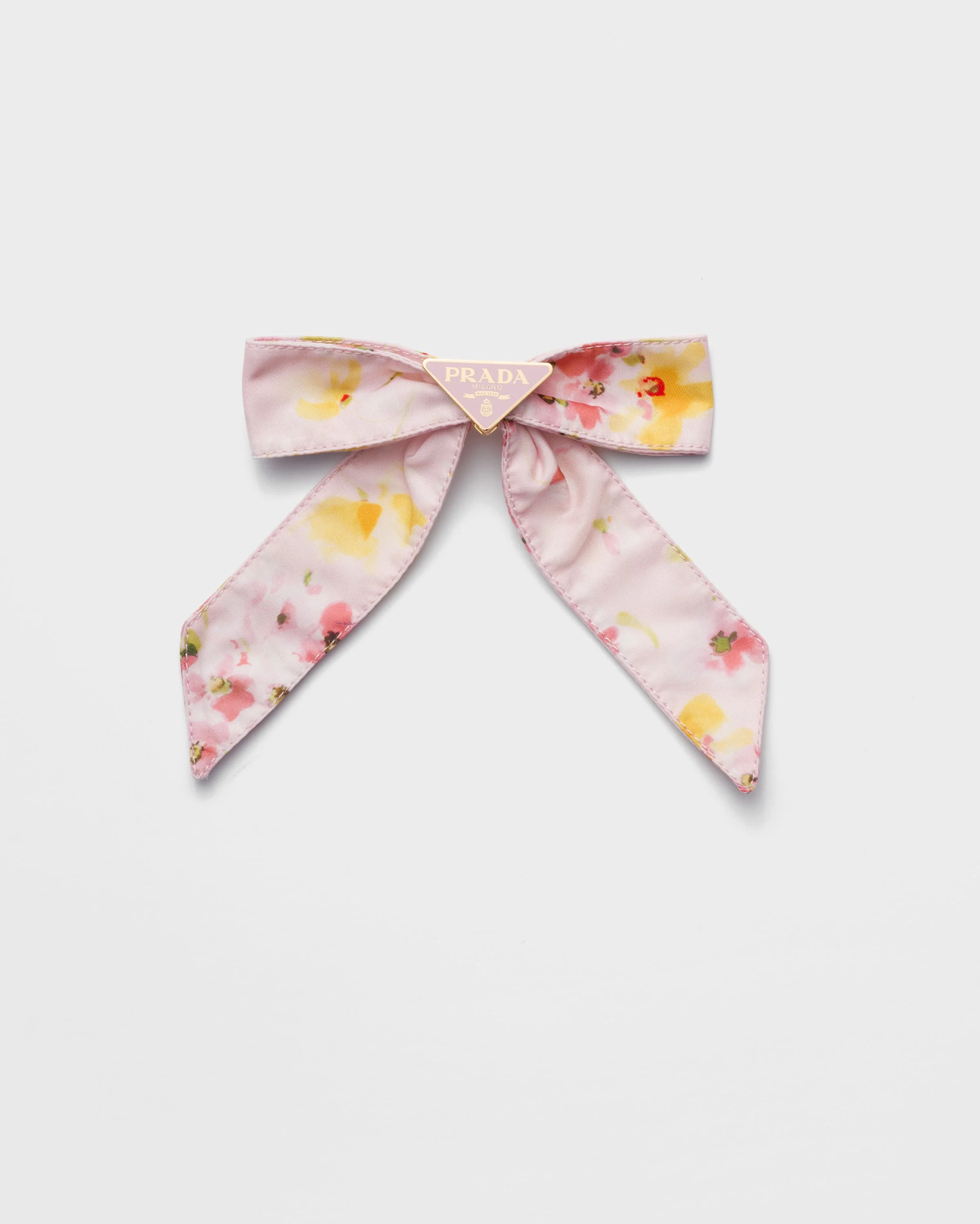 This bow hair clip is made of Re-Nylon, embellished with a romantic floral print. The enameled metal triangle logo completes the accessory with a distinctive note. - Product code: 1IF154_2HM4_F0E18 - Clip closure - Enameled metal triangle logo - Imported Height: 9cm Width: 15cm MATERIALS Main material: Cotton viscose