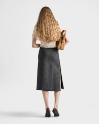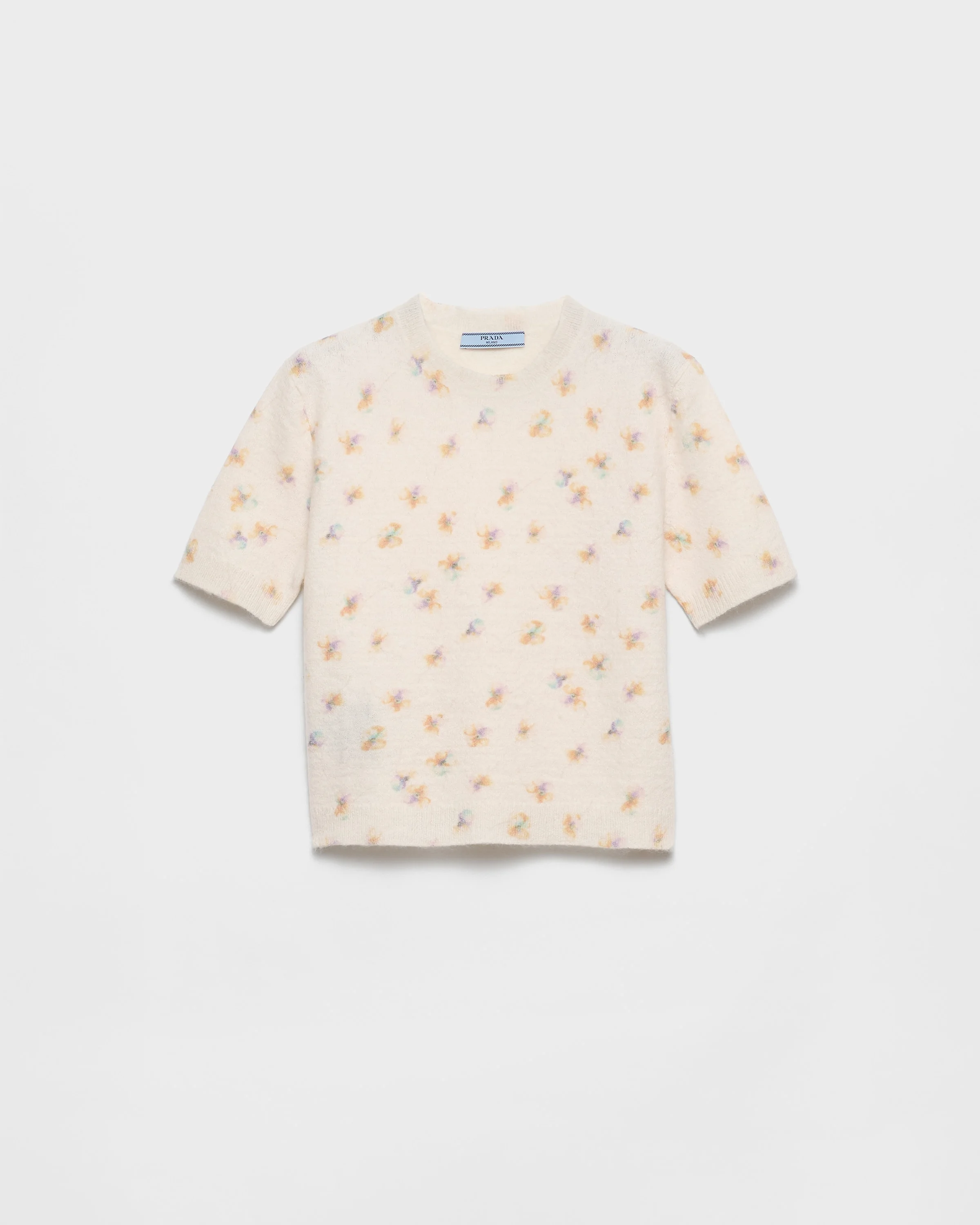 This wool sweater with short sleeves and a slim fit combines softness and structure. The design is enriched by a floral print for a romantic, delicate touch. - Product code: P24T2I_178I_F0061_S_OOO - Short sleeves - Plain knit with dyed print - Slim-fit silhouette - Ribbed knit crew neck - Regular shoulder - Ribbed knit sleeve trim and hem - Triangle logo - Printed garment - Imported - The model is 180 cm tall and wears a size 38 Height: 45cm MATERIALS Main material: 100% virgin wool