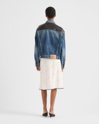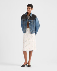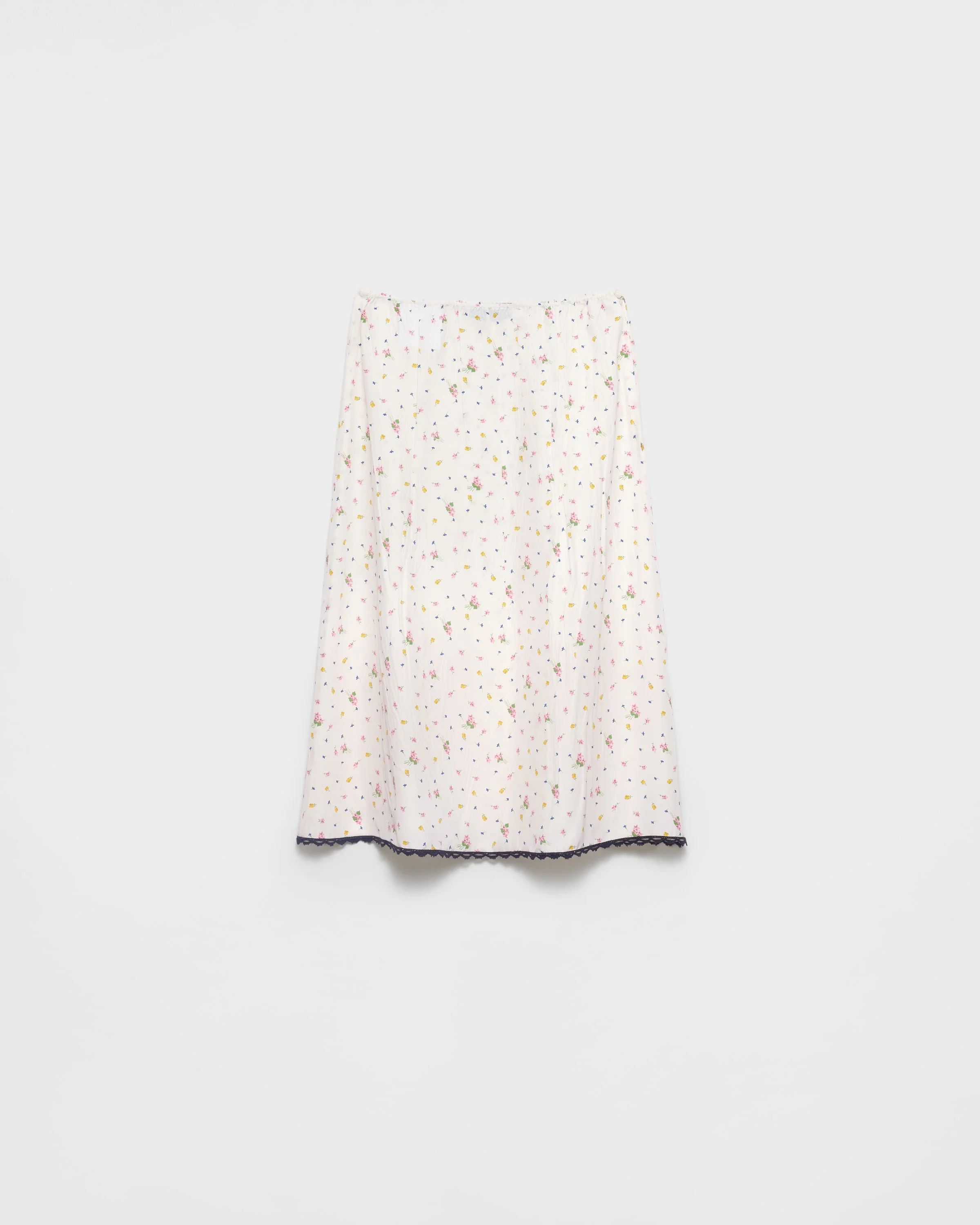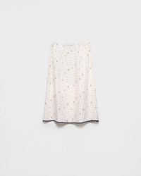 This light, delicate, lingerie-style skirt combines romantic notes and refined vintage details. The silhouette, defined by lace in a contrasting color on the hem, is embellished with a floral micro-print. - Product code: P199W_17K1_F0009_S_OOO - «Flowers» print - Flared fit - Garment with slip - Side snap closure with button - Fabric triangle logo - Lace-trimmed hem - Imported - The model is 177 cm tall and wears a size 38 Height: 65cm MATERIALS Main material: 38% silk 62% viscose