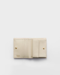 A romantic floral print embellishes this Saffiano leather wallet with classic lines. The refined and functional accessory has several pockets and an internal coin pocket. The enameled metal triangle logo completes it with a distinctive touch. - Product code: 1MV204_2HM6_F0507 - Snap closure - Enameled metal triangle logo - One bill compartment - Three card slots - Two internal pockets - Internal coin pocket with flap - Moire and leather lining - Imported Height: 11.2cm Width: 8.5cm MATERIALS Main material: Calfskin
