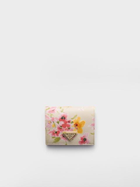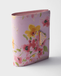 A romantic floral print embellishes this Saffiano leather wallet with classic lines. The refined and functional accessory has several pockets and an internal coin pocket. The enameled metal triangle logo completes it with a distinctive touch. - Product code: 1MV204_2HM6_F0E18 - Snap closure - Enameled metal triangle logo - One bill compartment - Three card slots - Two internal pockets - Internal coin pocket with flap - Moire and leather lining - Imported Height: 11.2cm Width: 8.5cm MATERIALS Main material: Calfskin