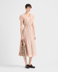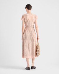 A delicate floral print enriches this light dress with a fit-and-flare silhouette featuring a skirt with softly flared lines. The design is characterized by a deliberately wrinkled effect, a distinctive detail of Prada collections. - Product code: P3Q10R_17OZ_F0924_S_OOO - Fit-and flare - Lined - Round neck with buttons - Side zipper closure - Short sleeves - Flared hem - Imported - The model is 181 cm tall and wears a size 38 Height: 120cm MATERIALS Main material: 38% silk 62% viscose