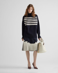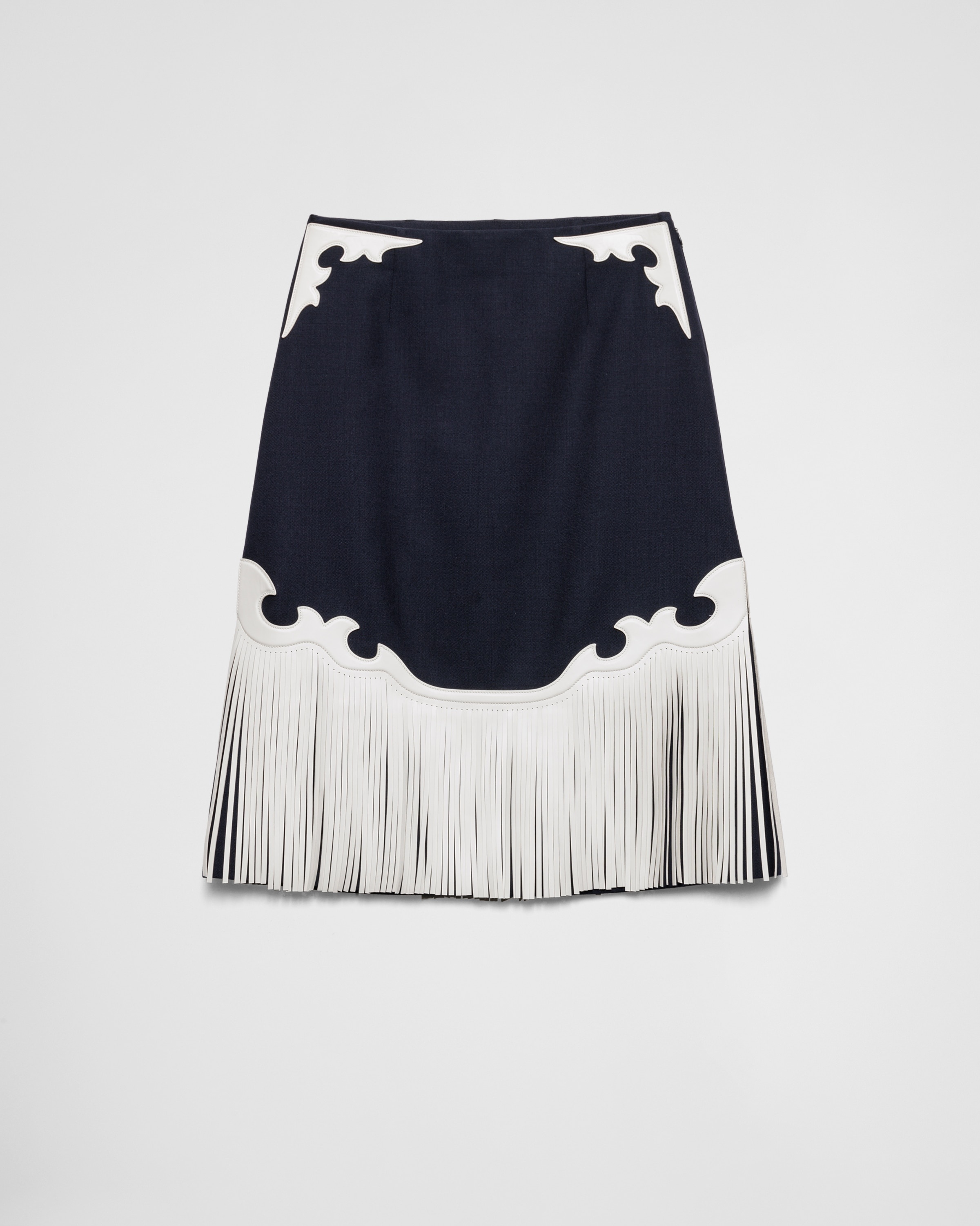 The many facets of the Prada aesthetic are reflected in the design of this skirt with bold, sophisticated details. Leather fringe and Western-style inserts enrich and give movement to the flared silhouette with bold contrasts. - Product code: P189YE_11CZ_F0008_S_OOO - Flared fit - Lined garment - Side zipper closure with hook - Leather fringe and inserts - Imported - The model is 179 cm tall and wears a size 38 Height: 70cm MATERIALS Main material: 100% virgin wool
