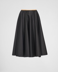 Ample lines and elegant volumes create the silhouette of this skirt with feminine allure, reinterpreted with the pragmatic touch of Re-Nylon. The innovative regenerated nylon fabric adds a modern touch to this timeless design trimmed with leather that helps define a style capable of combining Prada codes with unexpected details. The enameled metal triangle logo, enhanced by the leather base, completes the look with an iconic note. This product does not contribute to the SEA BEYOND educational program. - Product code: 21C925_1WQ8_F0002_S_OOO - Unlined - Zipper closure - Enameled metal triangle logo - Slash pockets - Regular waist - Leather-trimmed waist - Leather pull on side zipper - Imported - The model is 180 cm tall and wears a size 38 - Height: 75cm MATERIALS Nylon