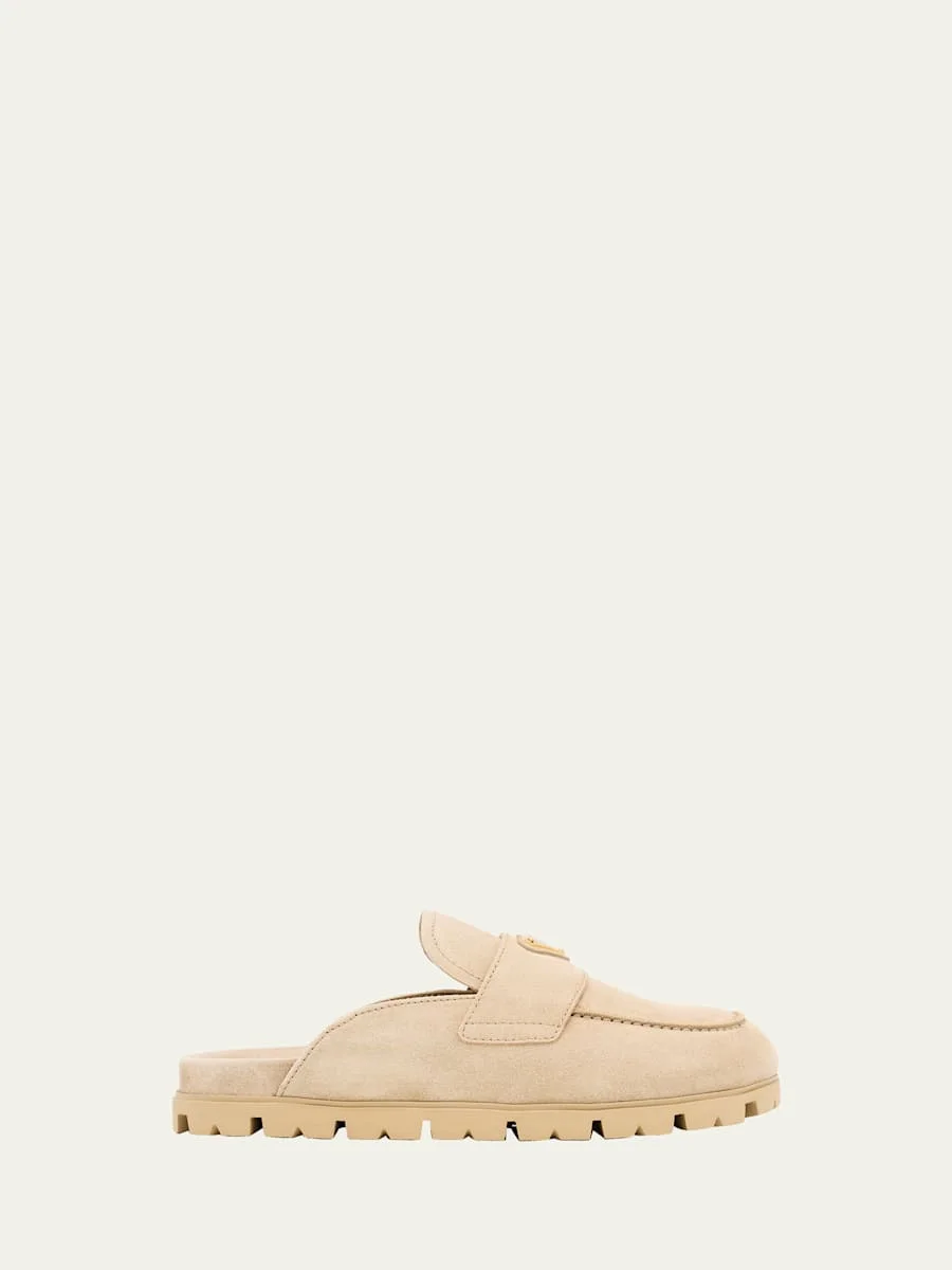 Prada "Fussbett" casual suede loafer mules with logo triangle accent 0.75 in / 20 mm flat heel Round moc toe Notched vamp Slide style Rubber outsole Lining: Leather Professional cleaning recommended Made in Italy Size Note: Runs true to size. Online Inquiries: BGS21_X6GET| Store Inquiries: #4693041