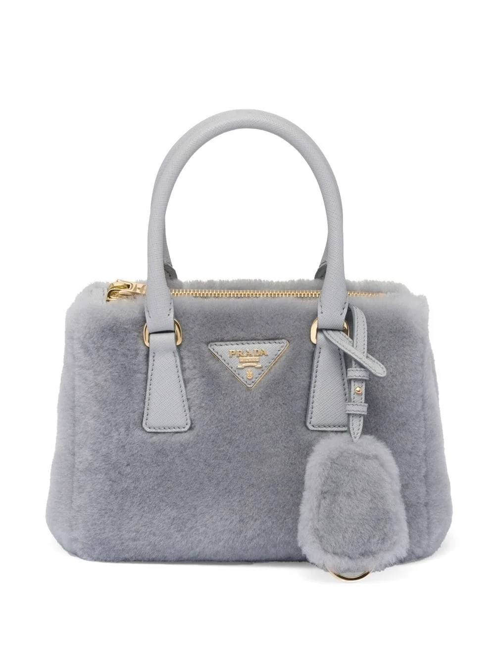 Galleria shearling mini bag Named after the historic Prada store that opened in 1913 in Galleria Vittorio Emanuele II of Milan, this Galleria tote pairs the brand's heritage with contemporary design. Made from soft, fuzzy shearling, it is presented in a slate grey hue for an extra modern appeal. Highlights - Slate grey - Calf leather - Shearling - Gold-tone logo plaque - Logo tag - Gold-tone hardware - Two top handles - Adjustable detachable shoulder strap - Two zip-fastening pockets - Main compartment - Internal logo plaque - Internal zip-fastening pocket Composition Outer: Calf Leather 100%, Sheep Skin/Shearling 100% Lining: Calf Leather 100% SIZE & FIT Measurement DEPTH 3.74 in(9.5 cm) HEIGHT 5.7 in(14.5 cm) STRAP 45.27 in(115 cm) WIDTH 7.87 in(20 cm)