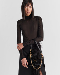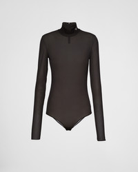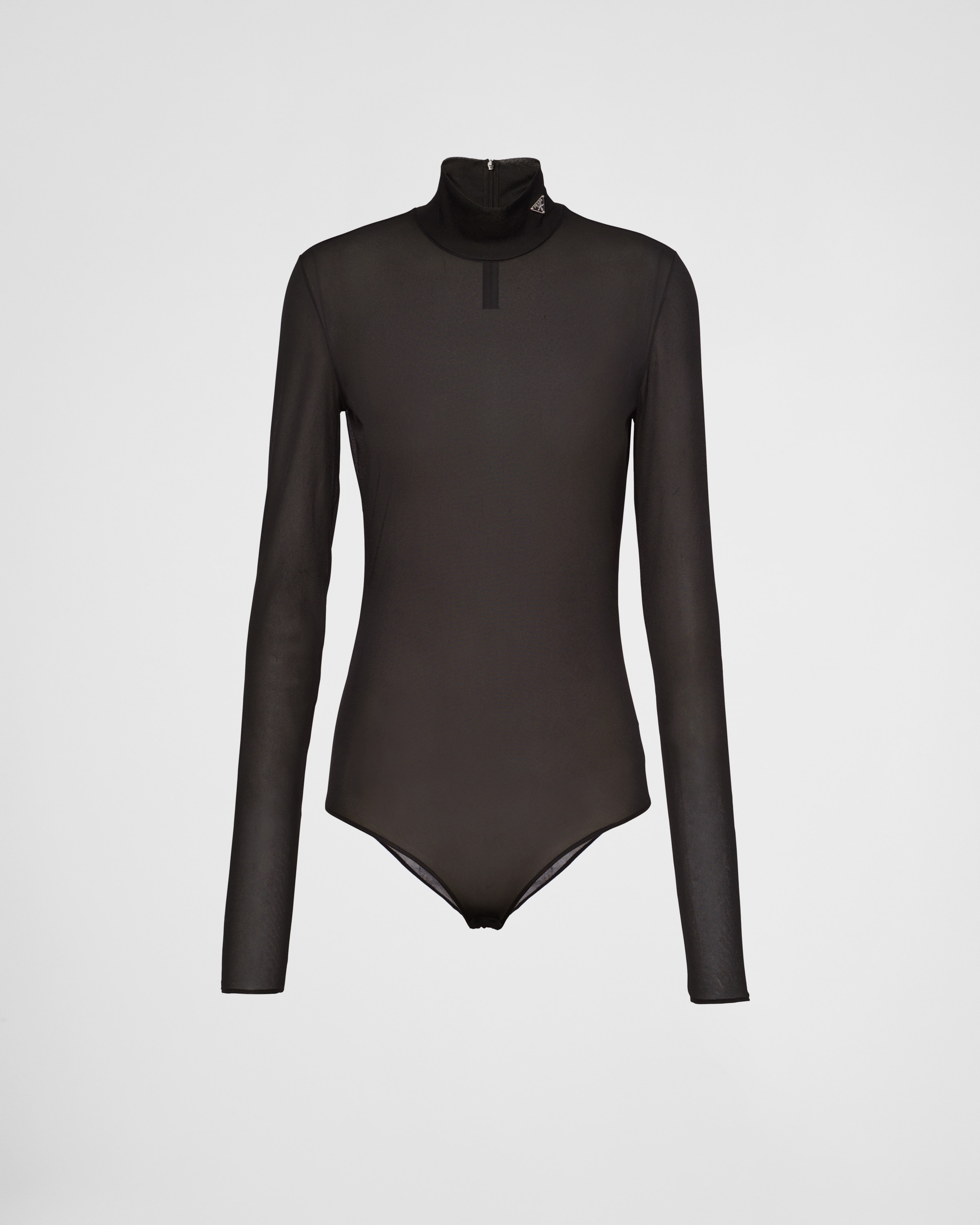 This long-sleeved bodysuit with a slim-fit silhouette is made of thin, semi-sheer jersey. The garment with back zipper is defined by the elegant mock turtleneck and is embellished with the enameled metal triangle logo. - Product code: 32152_130U_F0002_S_OOO - Slim-fit - Mock turtleneck - Back zipper closure - Long sleeves - Enameled metal triangle logo - Imported - The model is 180 cm tall and wears a size 38 MATERIALS Nylon