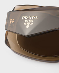 Acetate sunglasses with a geometric design and important volumes. The bold frame features an oversized square front defined by sharply beveled outer rims. The three-dimensional workmanship on the temples is decorated with an iconographic interpretation of the traditional Prada triangle logo. - Product code: SPRB23_E29E_FE90F_C_054 - Recycled bio-acetate frame front - Color: Chocolate + Gradient Chocolate - Frame not compatible with graduated lenses - 100% UVA / UVB protection - Standard fit - Lens-nose-temple measurements: 54-20-145 mm - Article comes with dedicated packaging - Other colors available - Imported MATERIALS Acetate