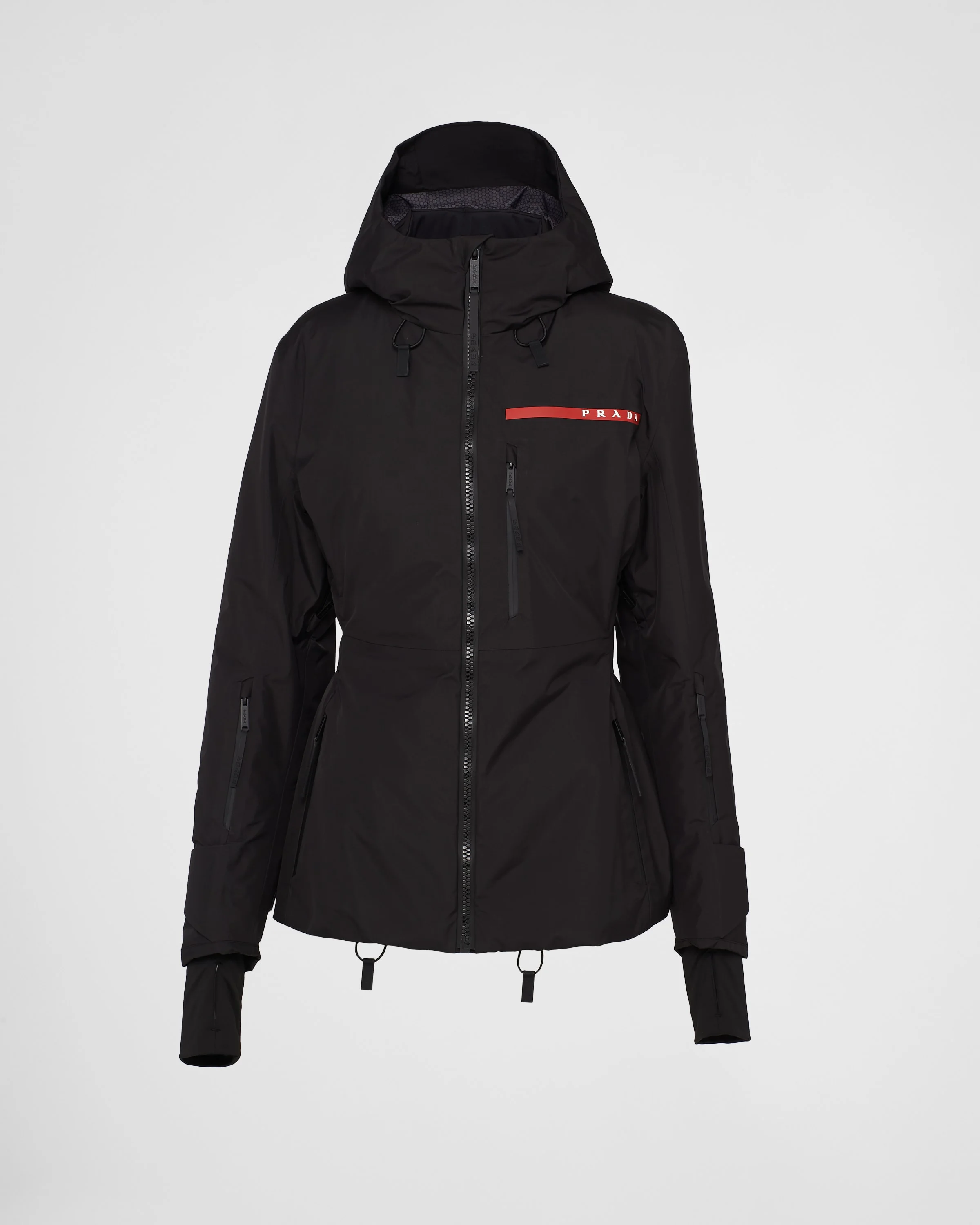 This ski jacket designed for high performance is made of Extreme-Tex, an innovative multilayer fabric. Made from recycled post-consumer polyester yarns, the three-layer fabric is breathable, waterproof and windproof. - Product code: 291935_1XV1_F0002_S_222 - Fitted silhouette - Long sleeve - Waxed zipper closure - Visible waxed zipper pockets - Cuff with hook-and-loop strap - Regular shoulder - Elasticized drawstring on hood and hem - Lined and padded with Graphene® - Heat-sealed tape seams - Prada Linea Rossa logo badge - Small vertical pocket on the front left - Internal fleece collar - Underarm zipper for ventilation - Small waxed zipper pockets on the sleeves - Wearable fleece inner jacket with hood and heat-sealed tape seams - Padded sleeves - Inside left pocket with heat-sealed eyelet for earphones - Windproof Lycra cuffs - PVC cellphone pocket - Elasticized Cuffs windproof in Lycra - Mobile phone pocket in pvc - Elasticized body belt with silicon band - Imported - The model is 178 cm tall and wears a size 38 Height: 66cm MATERIALS Main material: 100% recycled polyester