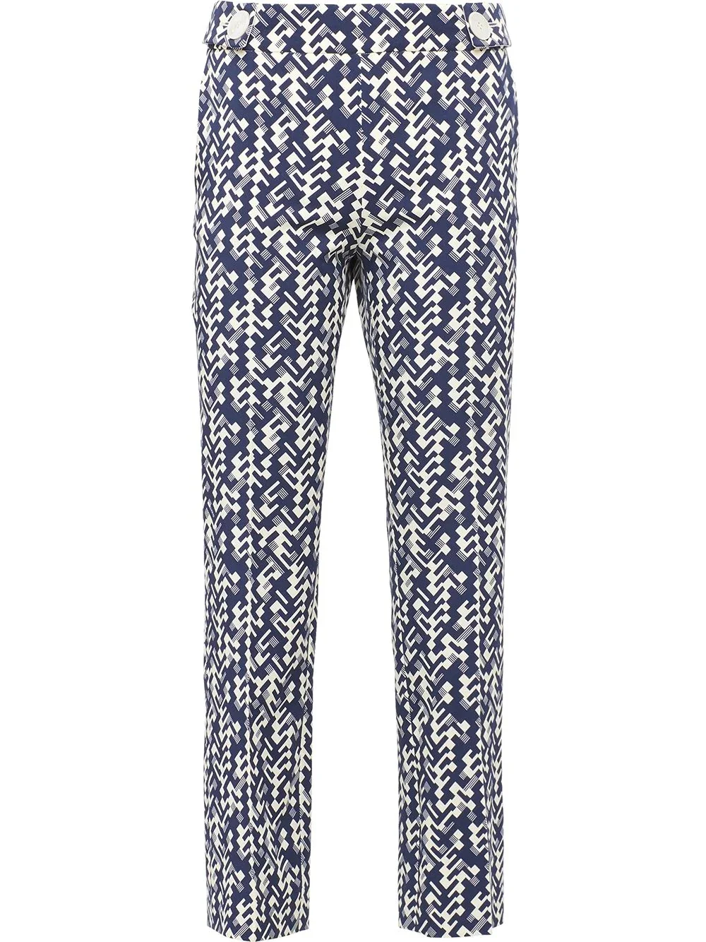 graphic print cropped trousers Dress like art. Crafted from a stretch virgin wool blend, these blue trousers from Prada are decorated with a geometric pattern that will remind you that happiness blooms from within... your closet. Highlights - Baltic blue - Stretch virgin wool blend - Cropped trousers - Geometric print - off-centre front button fastening - Two diagonal pockets to the sides Composition Virgin Wool 90%, Polyamide 8%, Spandex/Elastane 2%